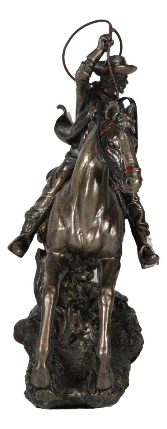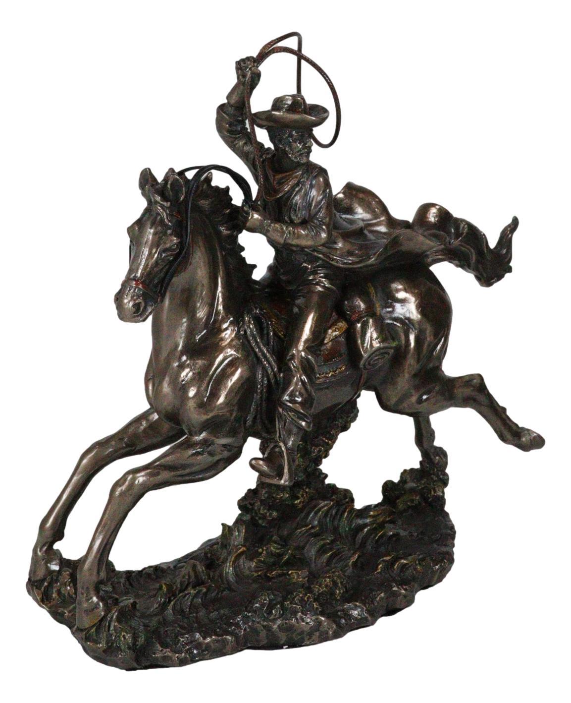 ? This Cowboy On Running Horse Figurine is a dramatic work of sculptural art that is a true statement piece for your home gallery, paying homage to the larger-than-life characters of the Old West. It features a rodeo cowboy flailing his lasso rope, riding on a running horse. Finished in faux bronze color, the sculpture will add rustic charm to any room you set him in.