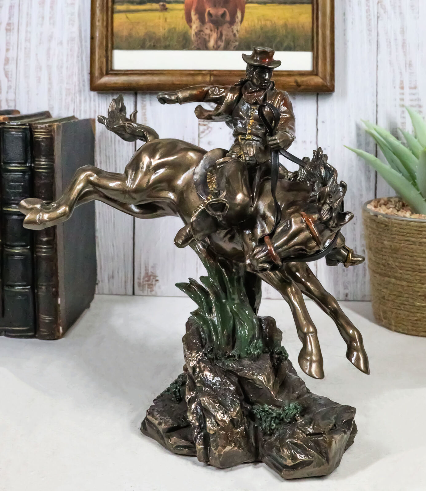 Rustic Western Rodeo Cowboy Riding On Galloping Wild Mustang Horse Figurine