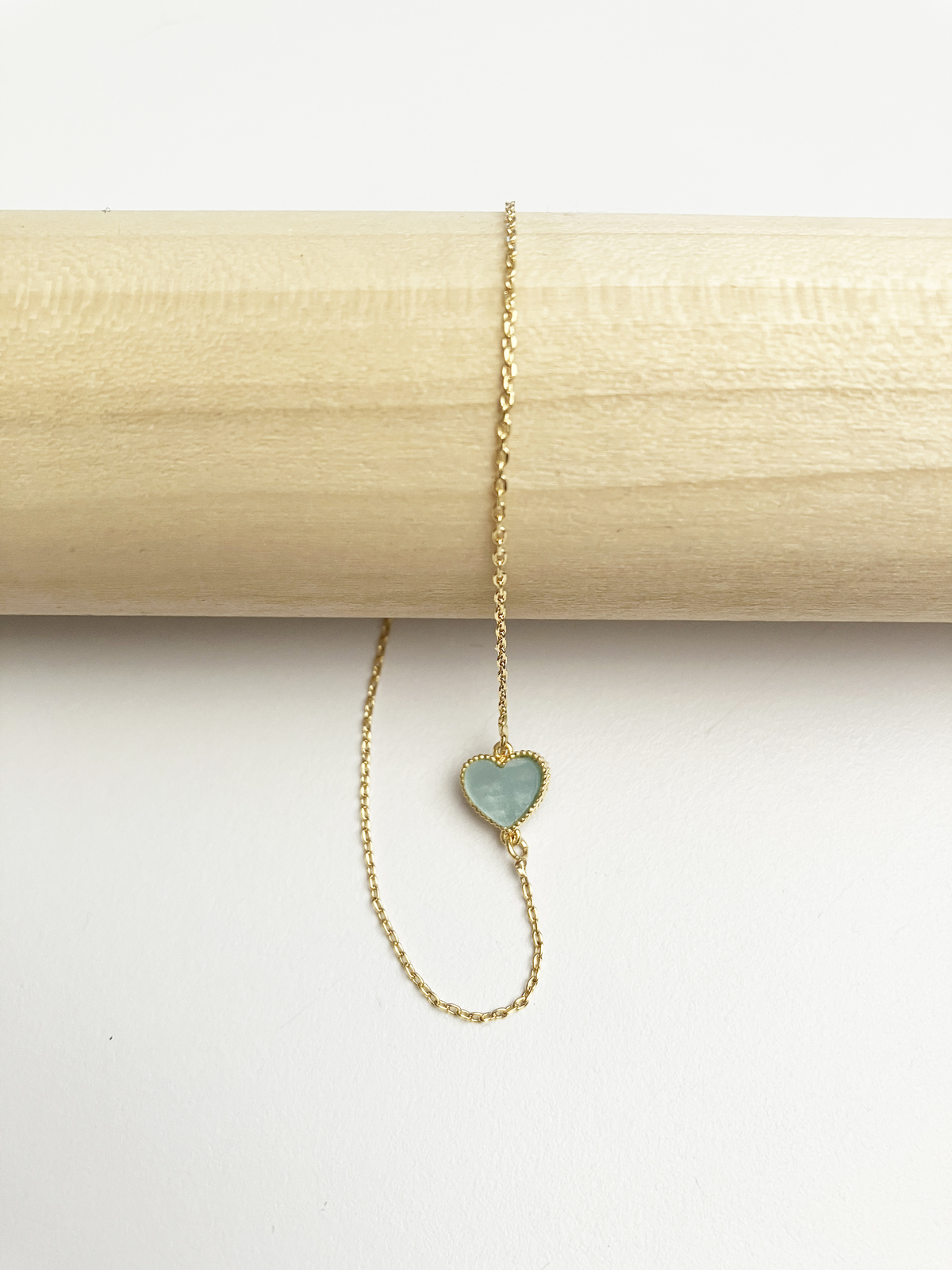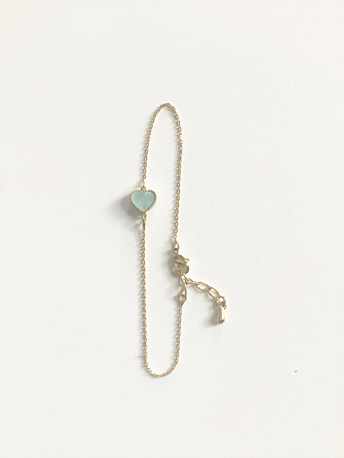Adorable heart motif bracelet with mint hued mother of pearl charm set into an adjustable gold plated non-tarnishing surgical steel chain with a lobster clasp. Collect the set!