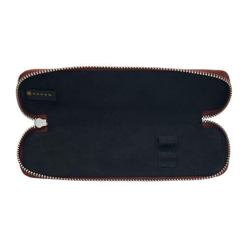 Double Pen Case with a zipper closure, soft black suede lining and two inner loops to secure the writing instruments.