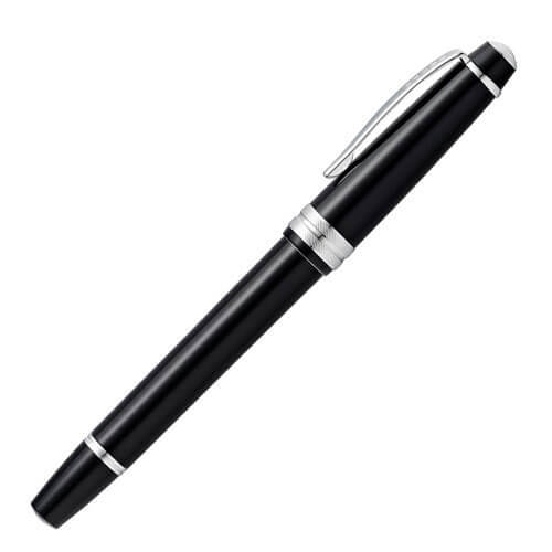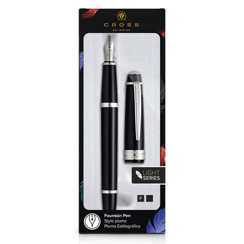 Time-honored Cross quality in a timely Lighter weight. Our Bailey light fountain pen shares the statement-making appeal and dependable performance of the original Cross Bailey metal Pen, but it weighs less in glossy Black resin. Comfortable in hand and pleasing to the eye, Bailey light is an ideal choice for everyday journaling and note-taking. This glossy Black fountain pen with chrome appointments features a stainless steel nib that adapts to your unique touch.