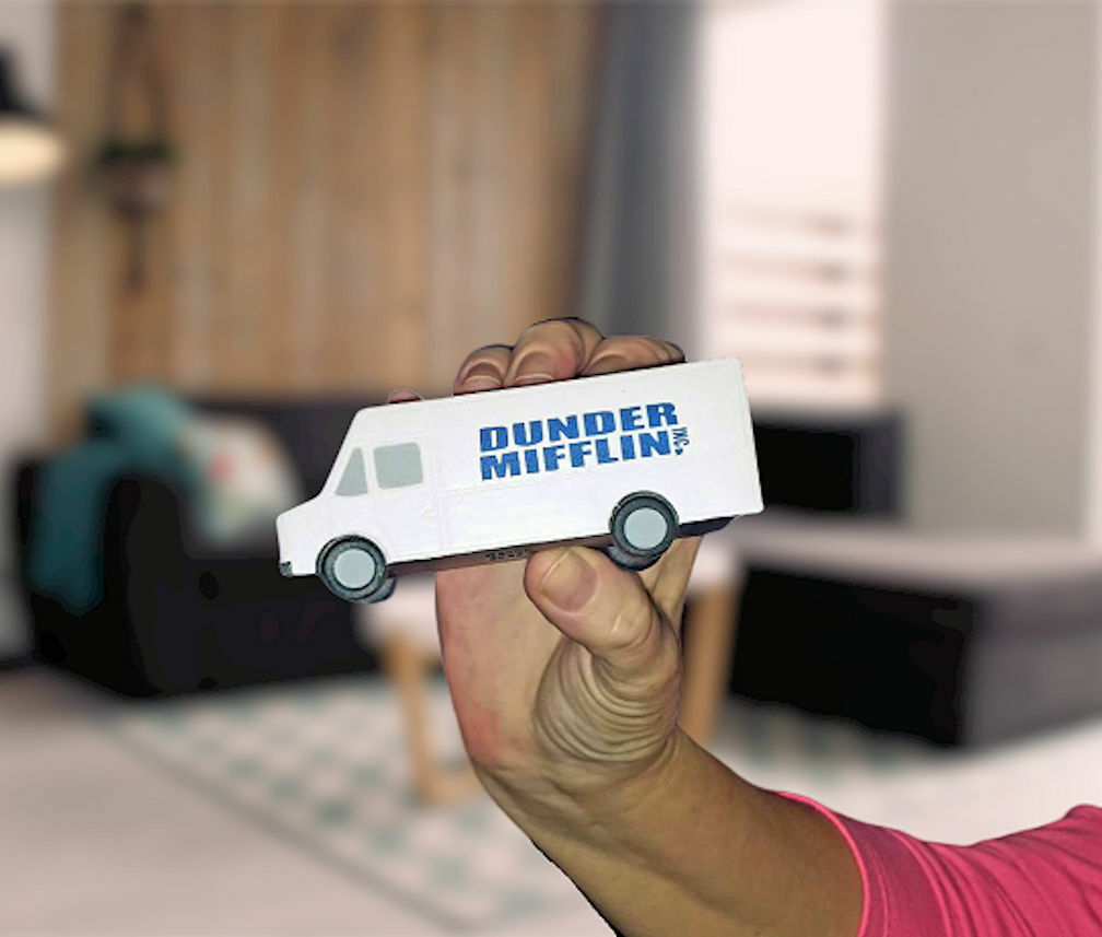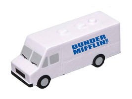 Dunder Mifflin Paper Truck shaped polyurethane stress reliever. Over 4 inches long! Great desktop piece. Useful and nice addition to any desk. Overall size: 4" x 1-3/8" x 1-1/4". Dunder Mifflin logo one one side. Limited Supply Promo piece.