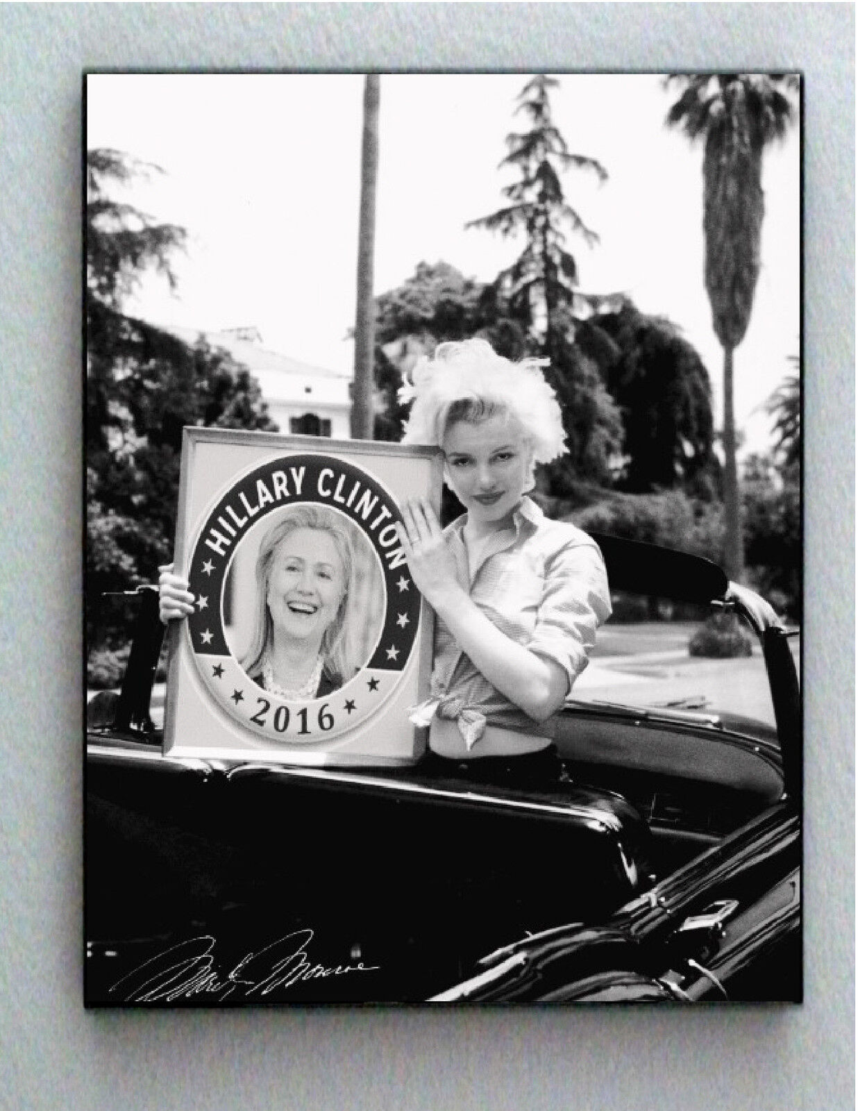 This is a framed picture of Marilyn Monroe sitting in a car holding a photo of Hillary. At the bottom is Marilyns facsimile autograph. The frame is borderless for a larger look. Frame has black trim and sticks out from the wall about an inch. The entire item is 8.5 X 11 inches and ready to display. Great fan piece and super gift.