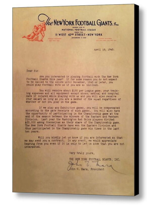 Framed, ready for display. This is a restored replica of an actual 1943 NFL contract offer from The New York Football Giants. Bottom signed by John Mara. It offers a salary and tries to convince the player to become a Giant. It talks about the Giants previous championships and other things. Great nostalgia piece that looks good in any Man Cave, Den, Office or game room. Actual size of original letter. 8.5 X 11.