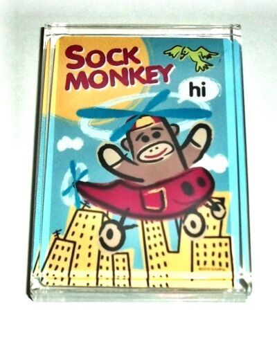 Very nice paperweight featuring a sock monkey illustration encased in crystal clear acrylic. It has the look and feel of real glass.