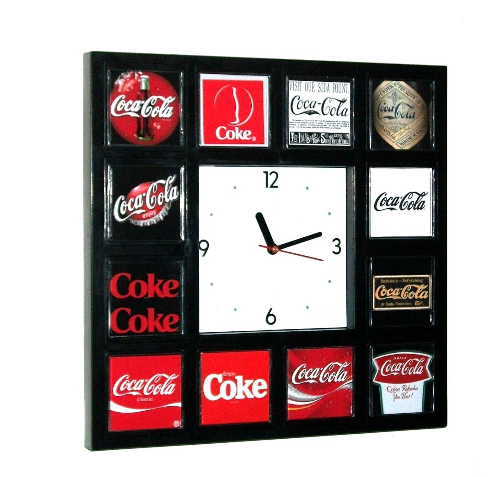 The clock face is surrounded by 12 rich full color images of the history of the Coke logo. From the first ever Coca-Cola ad til now. Each individual photo is acrylic encased for protection. This is for the true collector.