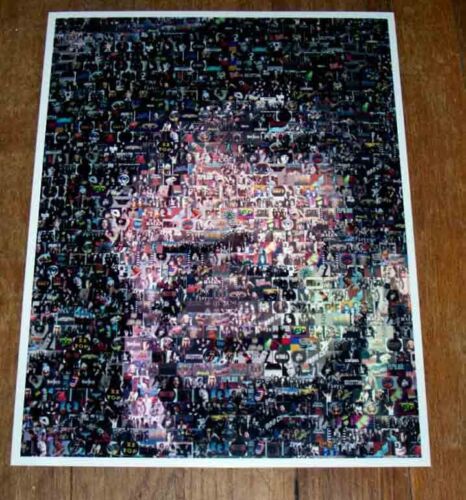 At first glance this looks like a picture of Jimi Hendrix but look closer. Its actually 100's of mini-pictures that are 1/4 inch by 1/4 inch with remarkable detail (click on "close up" image). The mini-pictures are of various photos and albums of the top 50 Rock Roll bands/Singers of all time including classic logos, vintage shots, all-time greats and more. The entire item is 8 1/2 inches by 11 inches and perfect for framing.