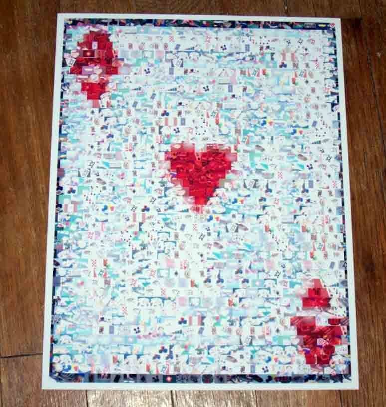 At first glance this looks like a picture of a big Ace of Hearts but look closer. Its actually 100's of mini-pictures that are 1/4 inch by 1/4 inch with remarkable detail (click on "close up" image). The mini-pictures are of everything POKER and Blackjack including cards, tables, hands, chips, money in all denominations and more. The entire item is 8 1/2 inches by 11 inches and perfect for framing.