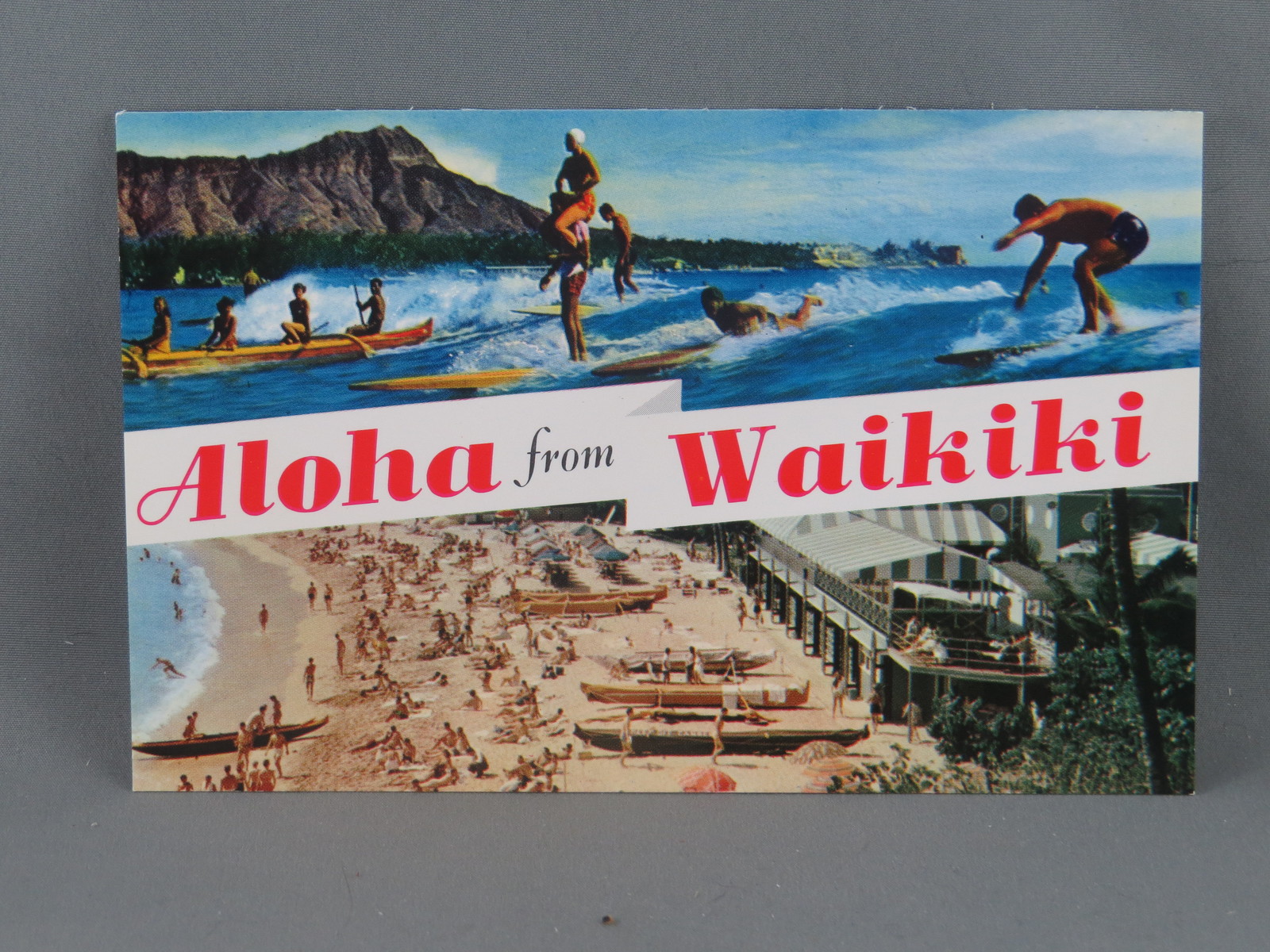 Up for sale is a vintage postcard. It features an image of surfers on the top and beachgoers on the bottom. The middle of the postcard has Aloha from Waikiki printed on a white banner. What a great addition to any collection.