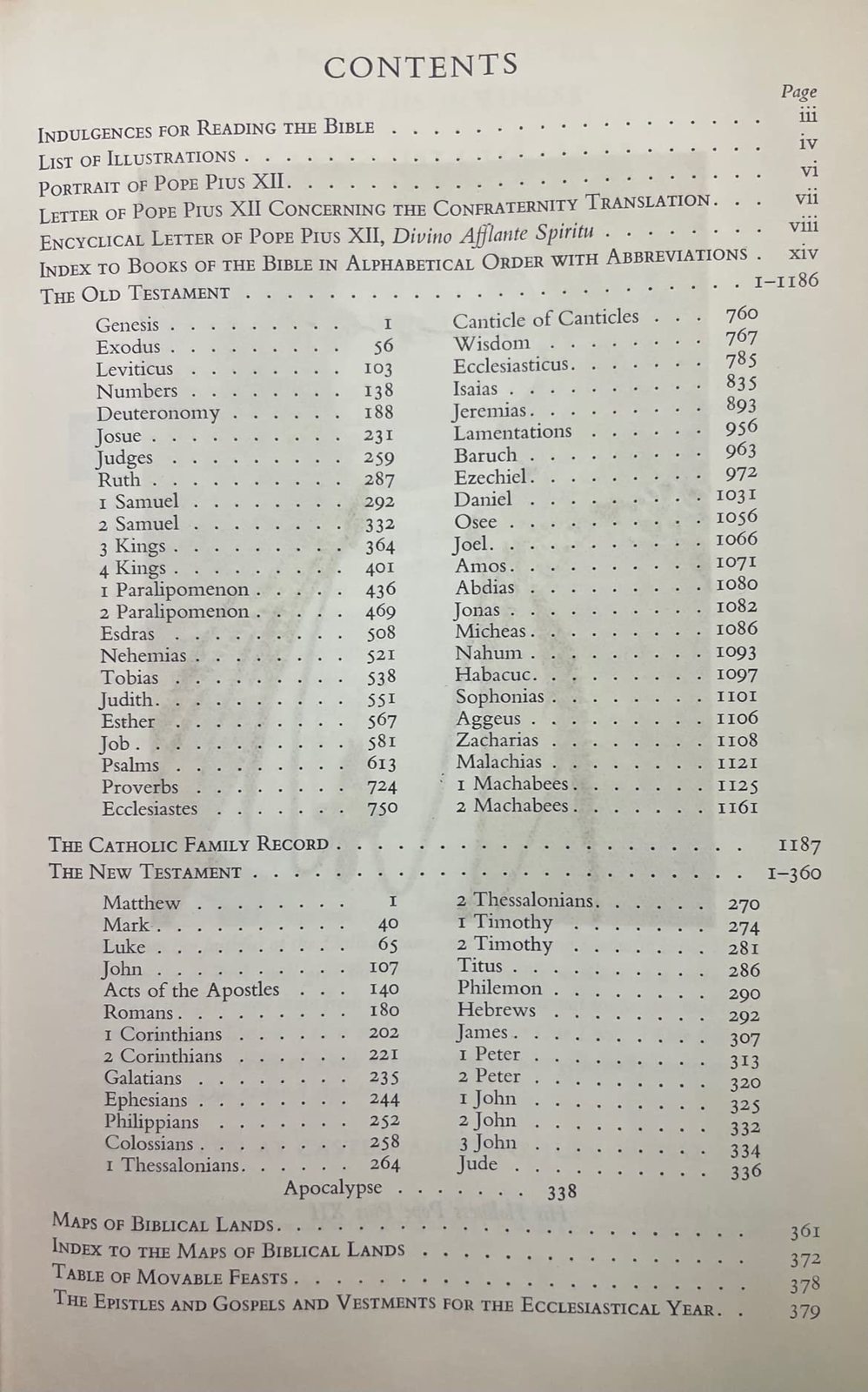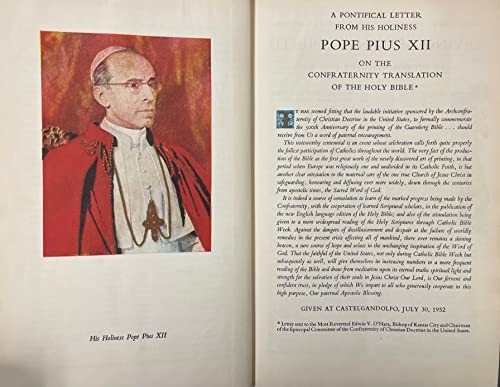 New York: John J. Crawley Co., Inc., 1953. First edition thus. The first eight Books and the Book of Psalms from the Old Testament and entire New Testament are in the Confraternity of Christian Doctrine text, the remaining Books are in the Challoner-Douay text. Beautiful presentation in full crimson red leather over beveled boards, lettering and decoration in gilt and black, all edges gilt, red silk moire endleaves, gilt tooled inner dentelles, three attached ribbon bookmarks, about 9 inches tall, just over 2.25 inches thick. Includes dedication page with hand-lettered name of Mabel Hogan Brookes. Color frontis for each Testament, other color plates, numerous other color illustrations throughout, decorative and historiated initials, unused decorative family record pages. Very good condition with some wear to the gilt edges of the text block, good hinges, firm text block, pages clean, previous owners name. First Edition Thus. Hard Cover. Very Good. 8vo - over 7" - 9" tall.