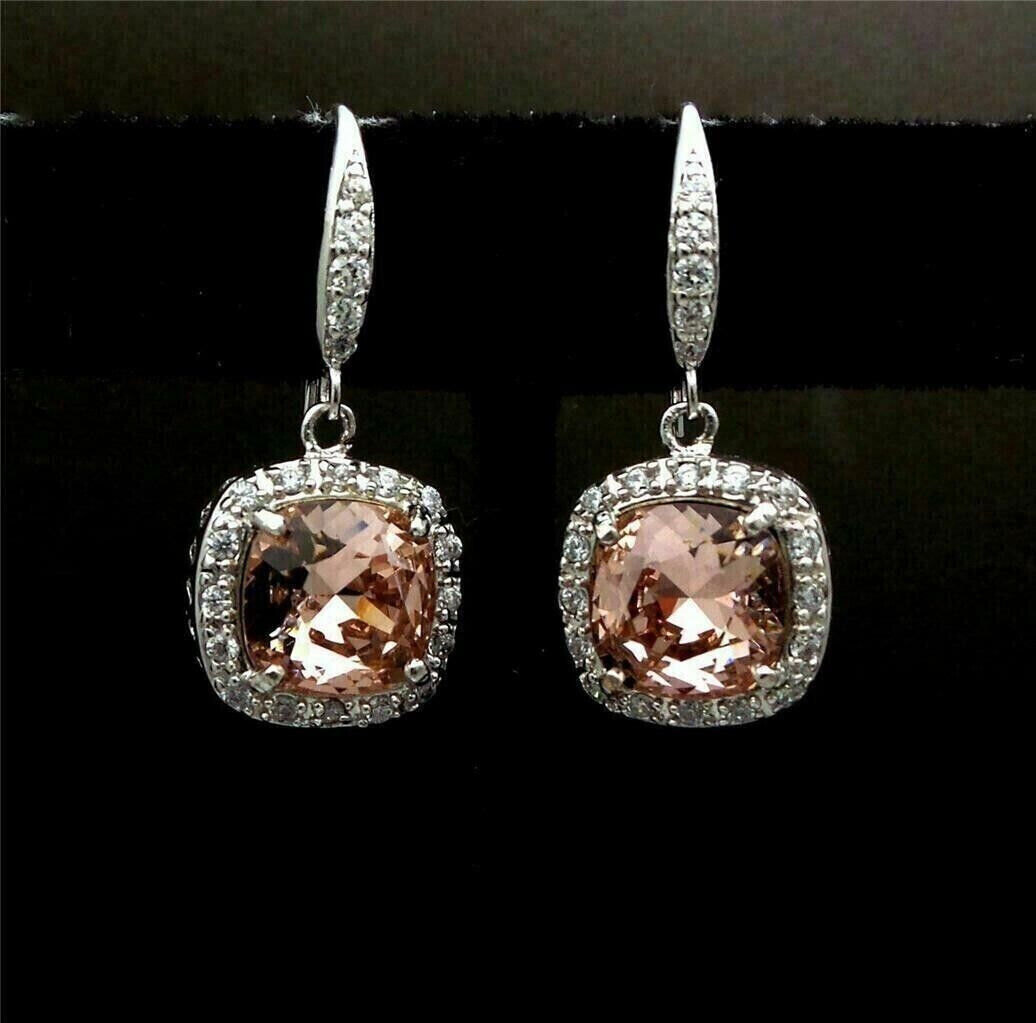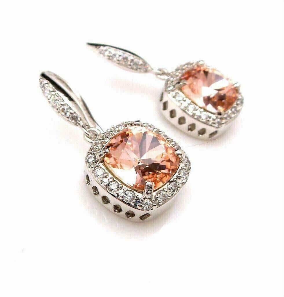 4Ct Cushion Cut CZ Morganite Halo Drop/Dangle Earrings 14K White Gold Plated