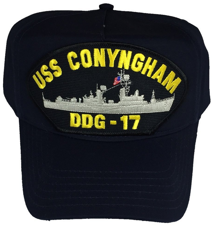 USS CONYNGHAM DDG-17 Hat - NAVY BLUE Golf Style hat. Veteran Owned Business. NAVY BLUE Cap High Detail and Impact - USS CONYNGHAM DDG-17 Hat. 8 Rows Stitching on Visor and Pro Stitch on Crown 5 panel hat. Adjustable Size with Velcro, NAVY BLUE Golf Style. Veteran and Family Owned and Operated Business - 2 Generations of Retired Marines!