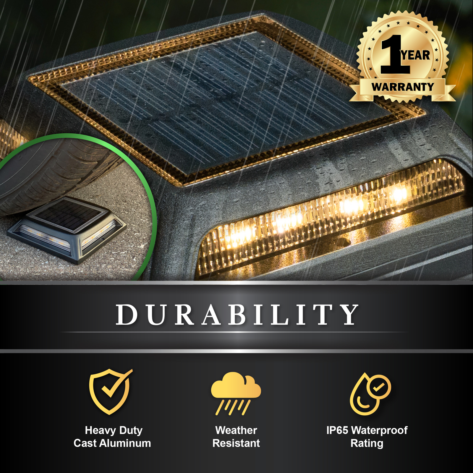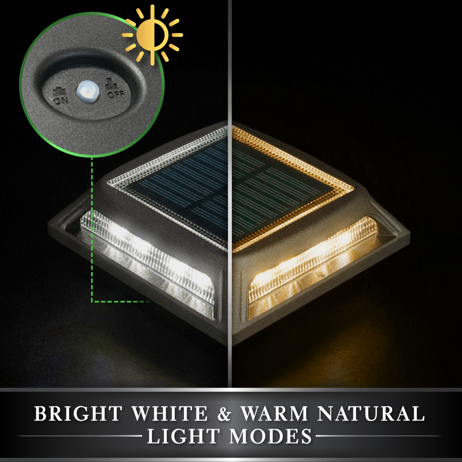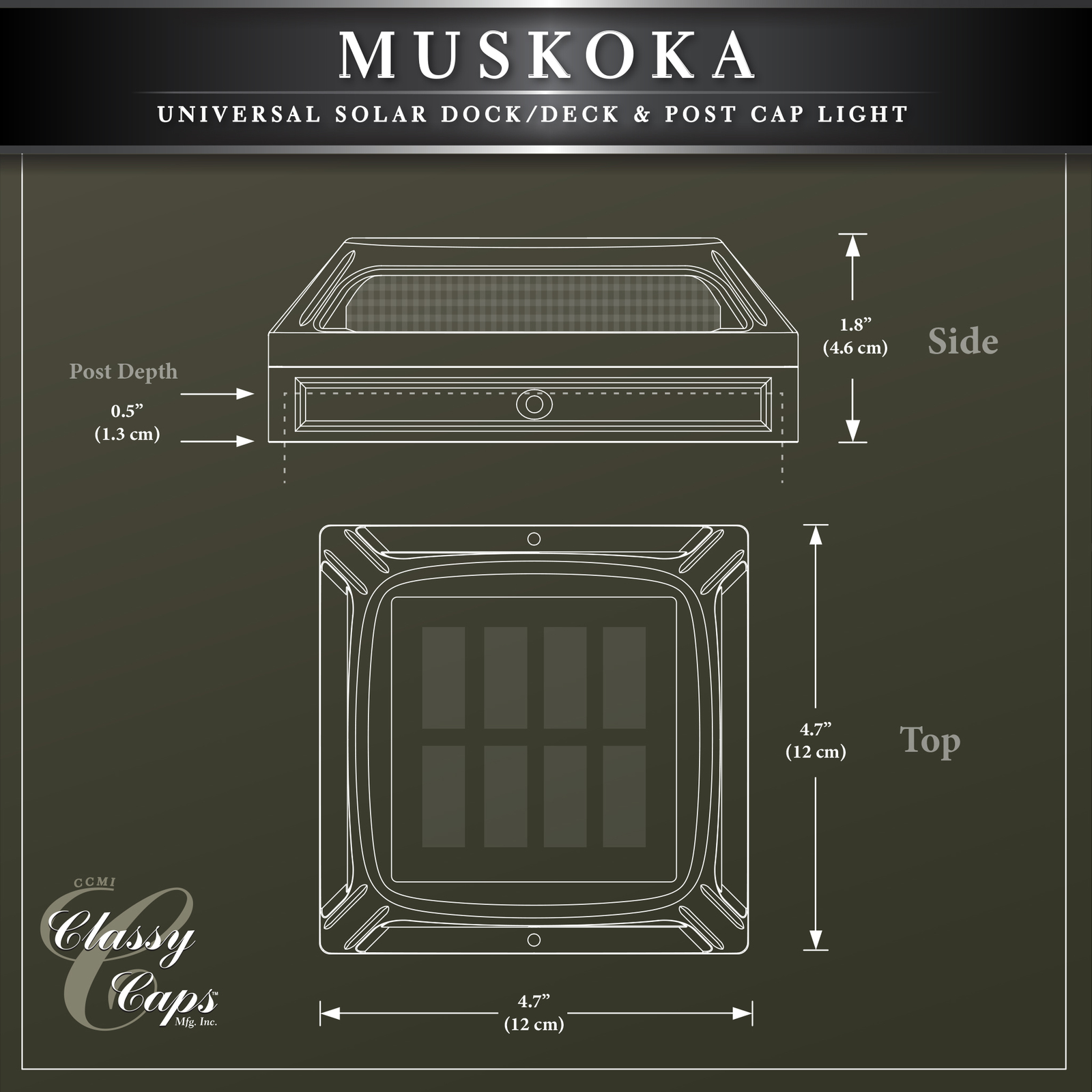 Introducing the Classy Caps Muskoka Solar Dock, Deck Post Cap Light -"The Most Universal Solar Light Fixture!” Boasting a total of 32 high performance surface mount LED's, you can choose from two lighting options with the push of a button - a warm natural light or bright white light. The Universal Muskoka solar light can be mounted to an actual 4”x4” 3.5”x3.5” post or can be mounted to decks, docks, driveways and pathways with the included accessories. Manufactured from heavy duty cast aluminum with durable matte black powder coat finish the versatile Muskoka exudes quality, adding elegance, charm and security to any outdoor setting. Quick and easy do-it-yourself installation. (25 Lumens / Warm natural light 2700-3200 kelvin or bright white light 4500-5500 Kelvin)