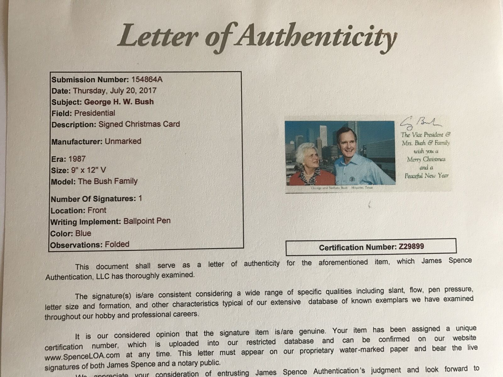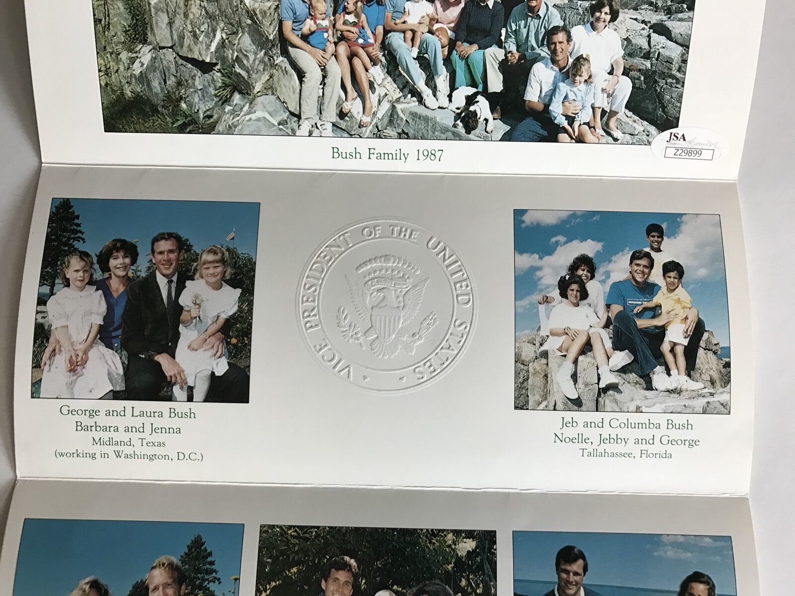 ITEM: PRESIDENT GEORGE H.W. BUSH SIGNED 1987 FAMILY CHRISTMAS CARD! THIS IS A VERY UNIQUE ITEM AS IT IS A CHRISTMAS CARD OF THE ENTIRE BUSH FAMILY INCLUDING: GEORGE W. amp; LAURA BUSH amp; GOV. JEB BUSH. IN ADDITION, THIS CARD WAS MADE amp; SIGNED DURING WHEN "H.W." WAS VICE PRESIDENT UNDER REAGAN. THIS IS A GREAT EARLY SHOT OF THE FUTURE PRESIDENT "GEORGE W." THESE ARE VERY RARE amp; HARD TO FIND WHICH INCLUDES THE VICE PRESIDENTIAL SEAL IN THE CARD AND CONSIDERED TO BE INTENDED FOR CLOSE FAMILY amp; FRIENDS amp; COLLEAGUES OF THE BUSH FAMILY. A TRUE MUST HAVE FOR ANY BUSH FAMILY FAN OR REPUBLICAN COLLECTORS. This item has been certified authentic by one of the most reputable and recognized authenticators in the business today, James Spence Authentication (JSA). It comes with a JSA Letter of Authenticity and also comes with a JSA numbered tamper proof authentication sticker that can be reviewed on their website 24/7/365.