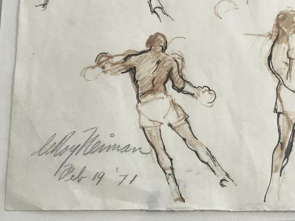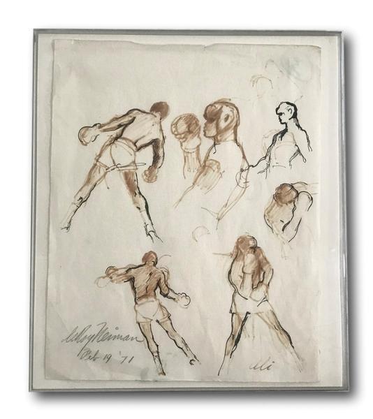 The words ?sports? and the ?1970?s? bring to mind two indelible visuals: Muhammad Ali and the colorful artwork of Leroy Neiman. Though the two men had firmly established themselves in their respective fields during the previous decade, both truly came into their own during the 1970?s and became cultural icons, known to even the most casual sports fan. Mere weeks before Ali fought Joe Frazier in ?The Fight of the Century,? the first of the Ali-Frazier Trilogy, Leroy Neiman filled a page of his sketchbook with figure studies of Ali. The master depicts the Champ in six classic boxing poses ? jabbing, weaving, ducking and posturing ? each one a potential subject for the artist?s distinctive style. Rendered in a beautiful sepia and black ink, the sketch vividly brings to life the excitement of Ali in action. The piece measures 12 x 15 inches and shows edge wear and light toning throughout and has been encased in a 13 oe x 16 x 1 OE inch plastic case.