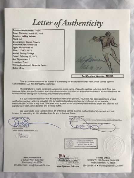 The words ldquo;sports rdquo; and the ldquo;1970 rsquo;s rdquo; bring to mind two indelible visuals: Muhammad Ali and the colorful artwork of Leroy Neiman. Though the two men had firmly established themselves in their respective fields during the previous decade, both truly came into their own during the 1970 rsquo;s and became cultural icons, known to even the most casual sports fan. Mere weeks before Ali fought Joe Frazier in ldquo;The Fight of the Century, rdquo; the first of the Ali-Frazier Trilogy, Leroy Neiman filled a page of his sketchbook with figure studies of Ali. The master depicts the Champ in six classic boxing poses ndash; jabbing, weaving, ducking and posturing ndash; each one a potential subject for the artist rsquo;s distinctive style. Rendered in a beautiful sepia and black ink, the sketch vividly brings to life the excitement of Ali in action. The piece measures 12 x 15 inches and shows edge wear and light toning throughout and has been encased in a 13 frac12; x 16 x 1 frac14; inch plastic case. This item has been certified authentic by one of the most reputable and recognized authenticators in the business today, James Spence Authentication (JSA). This baseball includes the JSA Letter of Authenticity and JSA tamper-proof hologram (on the letter of authenticity) guaranteeing this one of a kind item is the real thing. Check out the photos of the Letter of Authenticity to verify the information we have stated in this listing. You can verify this Certificate # on their online database available 24/7/365.