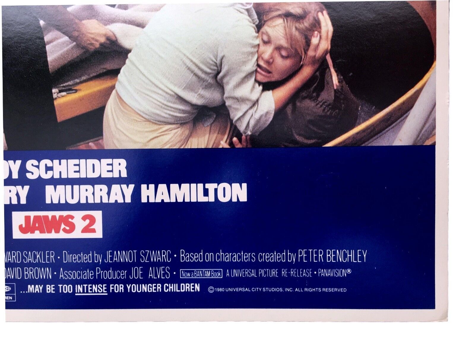 LOOKING FOR THE NEXT BIG THING TO ADD TO YOUR MEMORABILIA COLLECTION? WELL THIS IS IT! ldquo;JAWS 2 rdquo; STARRING: ROY SCHEIDER, LORRAINE GARY, MURRAY HAMILTON Copyrighted/Dated: 198011" X 14" in Size NOT A Bootleg or Reproduction - Guaranteed ORIGINAL THEATRICAL LOBBY CARD USED IN A MOVIE THEATRE AROUND TIME OF RELEASE OF THE MOVIE. CONDITION: Poster is in -Vintage Condition- and of investment quality. This ORIGINAL lobby card was used at a movie theatre. It may or may not have staple marks at corners, wrinkling, slight tears around edges, rounded corners, etc. from being originally displayed at a movie theatre or overtime natural wear. Colors and Detail are outstanding for this day amp; age, photos may not completely pick up high quality of coloring and inks until you see in hand. PLEASE MAKE YOUR PERSONAL ASSESSMENT OF THE CONDITION OF THIS POSTER FROM THE PHOTOS PROVIDED IN THE LISTING. The above condition issues are not exact for this poster so please take a look at the photos to determine the condition. MAKE SURE YOU CHECK OUT OUR OTHER ORIGNAL MOVIE POSTERS amp; LOBBY CARDS FROM THE 1930s AND ON IN OUR ONLINE SHOP! CHANCES ARE WE MAY HAVE MORE THAN ONE LOBBY CARD FROM THE SAME MOVIE OR EVEN A COMPLETE SET AVAILABLE. WE HAVE MANY TITLE CARDS AVAILABLE AS WELL AS KEY SCENES FROM ICONIC MOVIES ON HAND!! CHECK THEM OUT. Thanks for looking. We ship our items very protected and secure to make sure the item(s) make it to you safely!!