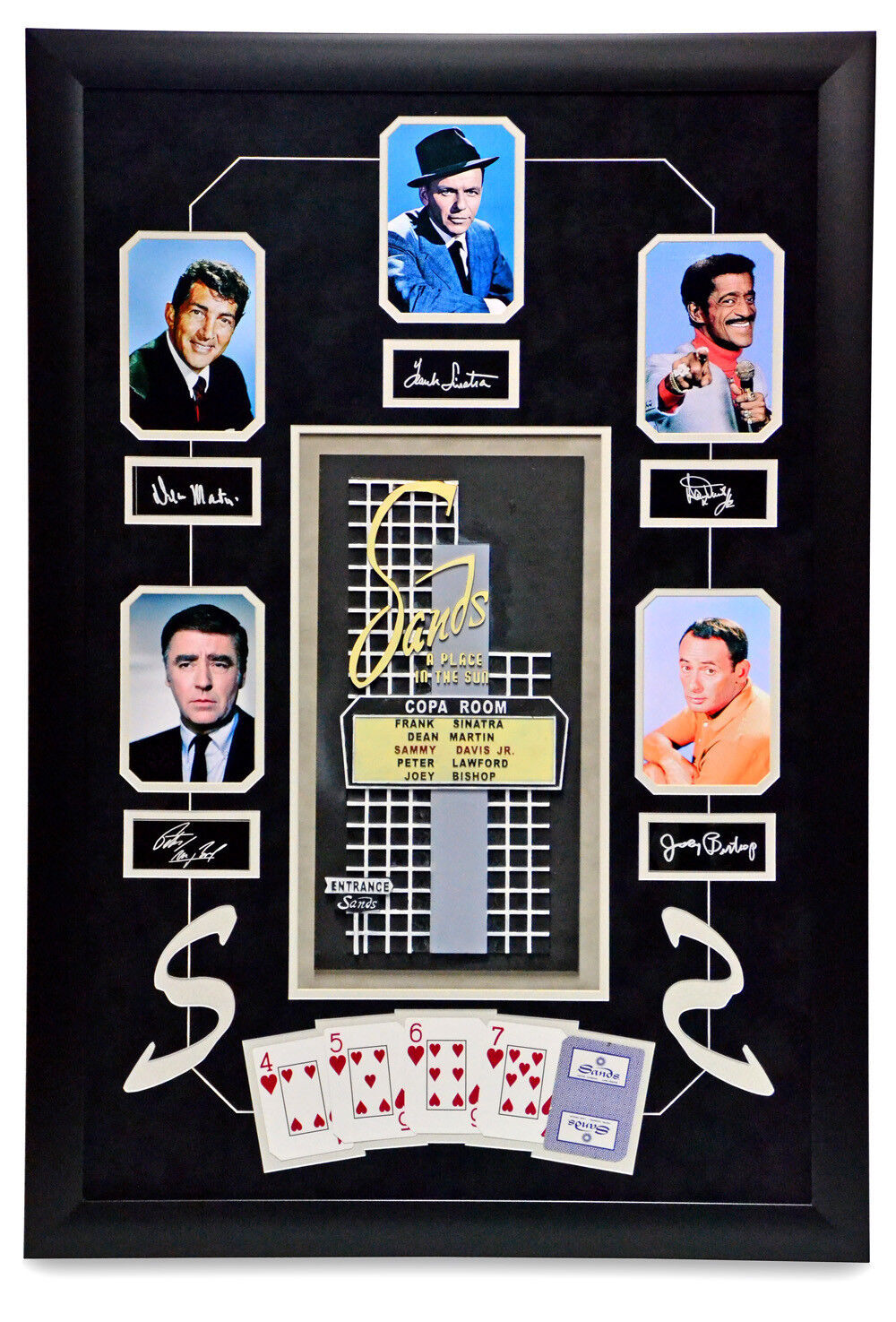 LOOKING FOR THAT ONE UNIQUE PIECE THAT YOU JUST CAN'T SEEM TO FIND? WELL THIS IS IT! HAND PAINTED SCULPTURE OF THE ORIGINAL "SANDS" SIGN FROM LAS VEGAS, FRAMED WITH MEMBERS OF THE RAT PACK MEMORABILIA! THIS UNIQUE PIECE FEATURES FACSIMILE SIGNATURES FROM THE ICONIC GROUP AS WELL AS AN ACTUAL AUTHENTIC SANDS PLAYING CARD FROM THE ORIGINAL HOTEL! THE SANDS HOTEL IN LAS VEGAS NO LONGER EXISTS BUT THE SPIRIT AND MUSIC OF THE RAT PACK LIVES ON FOREVER! OWN THIS COLLECTORS ITEM WHICH INCLUDES A CERTIFICATE OF AUTHENTICITY FROM INSCRIPTAGRAPHS CERTIFYING THAT THE SCULPTURE IS A TRUE HAND PAINTED LIMITED EDITION SCULPTURE, ONLY 50 EVER MADE! ONE OF THE BEST PIECES OUT NOW TO ADD TO YOUR MAN CAVE!