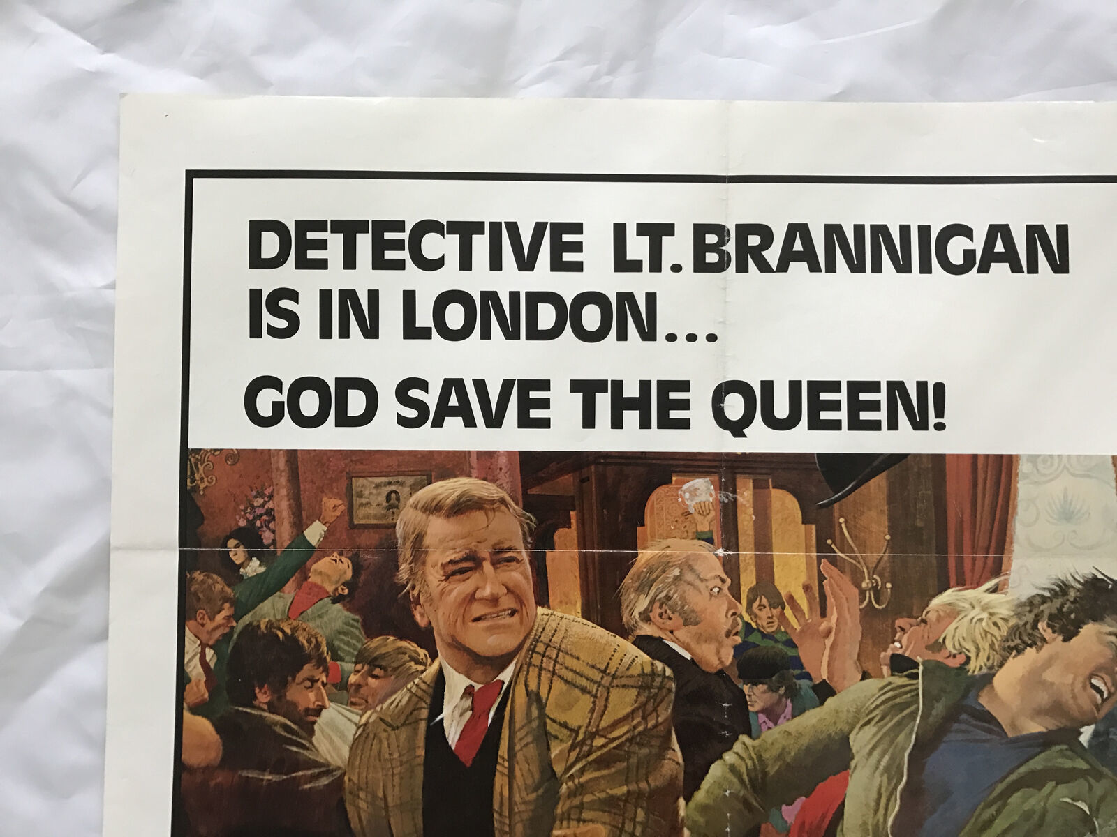 LOOKING FOR THE NEXT BIG THING TO ADD TO YOUR MEMORABILIA COLLECTION? WELL THIS IS IT! ldquo;BRANNIGAN! rdquo; STARRING: JOHN WAYNE, RICHARD ATTENBOROUGH, JUDY GEESON amp; MEL FERRER NOT A Bootleg or Reproduction-Guaranteed ORIGINAL THEATRICAL POSTER USED IN A MOVIE THEATRE AROUND TIME OF RELEASE OF THE MOVIE. Folded Poster Copyrighted/Dated: 1975 Size: 27"x 40" CONDITION: Poster is in -Vintage Condition- and of investment quality. This ORIGINAL poster was used at a theatre (as were most real posters). It may have staple marks at corners, wrinkling, slight tears around edges, rounded corners, etc. from being originally displayed at a movie theatre. The folds may also have tiny tears with cross point separation. Border may have minor wear typical of the older originals. Colors, and Detail are outstanding for this day amp; age. PLEASE MAKE YOUR PERSONAL ASSESSMENT OF THE CONDITION OF THIS POSTER FROM THE PHOTOS PROVIDED IN THE LISTING. The above condition issues are not exact for this poster so please take a look at the photos to determine the condition. This item WILL SHIP FOLDED and carefully packaged unless you do not want this option an additional fee of $50 will apply if you want the poster flat as pictured in the photos. Email us for this additional service and any detailed condition information and picture close ups of this poster. Thanks for looking.