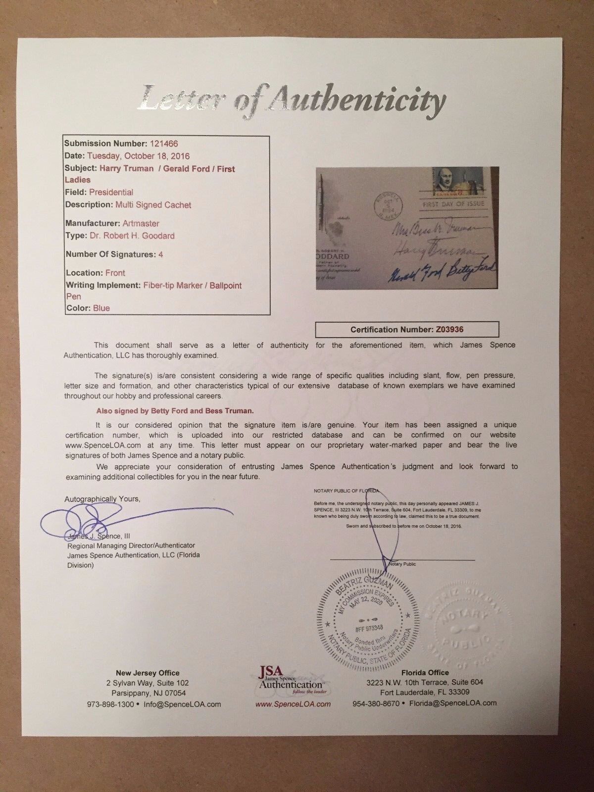 LOOKING FOR THAT UNIQUE ITEM FOR YOUR MAN CAVE? WELL THIS IS IT!! "FIRST DAY OF ISSUE" ENVELOPE SIGNED BY US PRESIDENTS HARRY TRUMAN amp; GERLAD FORD AS WELL AS FIRST LADIES, BESS TRUMAN AND BETTY TRUMAN!! THIS IS A VERY RARE ITEM AS YOU NEVER SIGNED ITEMS SIGNED BY A PRESIDENT AND A FIRST LADY ON THE SAME ITEM YET ALONE 2 OF EACH!! WHO KNOWS, THIS COULD BE THE ONLY ITEM EVER AUTOGRAPHED WITH TRUMAN AND FORD ON THE SAME ITEM IN EXISTENCE!!! The ultimate autograph for presidential collectors!! This item has been certified authentic by one of the most reputable and recognized authenticators in the business today, James Spence Authentication (JSA). It comes with a JSA Letter of Authenticity and also comes with a JSA numbered tamper proof authentication sticker on the back of the item that can be reviewed on their website 24/7/365. Do not miss out on this autograph as it won't last long!! CHECK OUT OUR OTHER ITEMS IN OUR STORE TO SAVE ON SHIPPING! AUCTION CONDITIONS: - PAYMENT IS DUE WITHIN 3 DAYS FROM ENDING OF AUCTION -ITEM WILL BE SHIPPED WITHIN 3 DAYS UPON RECEIPT OF PAYMENT -SHIPPING: -FREE CONTINENTAL UNITED STATES SHIPPING ONLY -CONTACT US AHEAD OF TIME FOR ALL OTHER INTERNATIONAL SHIPPING FEEL FREE TO ASK ANY QUESTIONS YOU MAY HAVE! CHECK OUT OUR OTHER ITEMS TO SAVE MONEY ON SHIPPING!