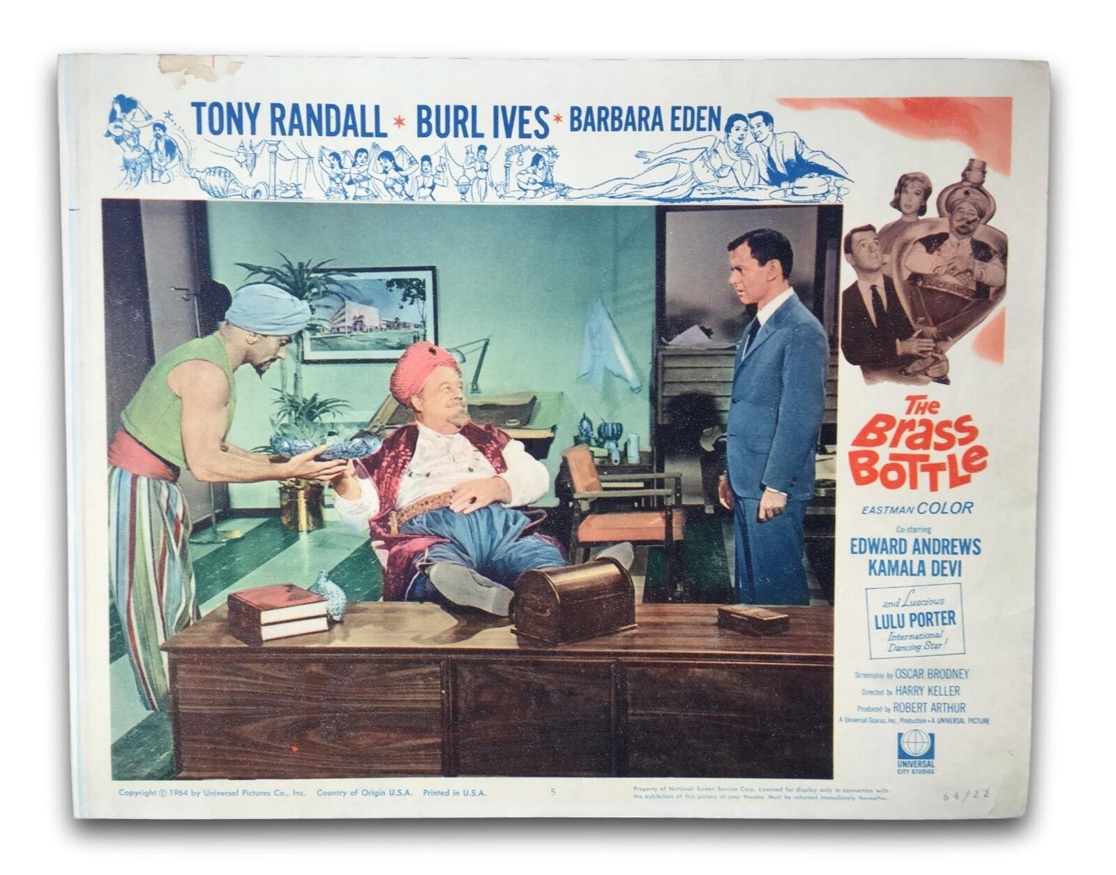LOOKING FOR THE NEXT BIG THING TO ADD TO YOUR MEMORABILIA COLLECTION? WELL THIS IS IT! ldquo;THE BRASS BOTTLE rdquo; STARRING: TONY RANDALL, BURL IVES, BARBARA EEN Copyrighted/Dated: 196411" X 14" in Size NOT A Bootleg or Reproduction - Guaranteed ORIGINAL THEATRICAL LOBBY CARD USED IN A MOVIE THEATRE AROUND TIME OF RELEASE OF THE MOVIE. CONDITION: Poster is in -Vintage Condition- and of investment quality. This ORIGINAL lobby card was used at a movie theatre. It may or may not have staple marks at corners, wrinkling, slight tears around edges, rounded corners, etc. from being originally displayed at a movie theatre or overtime natural wear. Colors and Detail are outstanding for this day amp; age, photos may not completely pick up high quality of coloring and inks until you see in hand. PLEASE MAKE YOUR PERSONAL ASSESSMENT OF THE CONDITION OF THIS POSTER FROM THE PHOTOS PROVIDED IN THE LISTING. The above condition issues are not exact for this poster so please take a look at the photos to determine the condition. MAKE SURE YOU CHECK OUT OUR OTHER ORIGNAL MOVIE POSTERS amp; LOBBY CARDS FROM THE 1930s AND ON IN OUR ONLINE SHOP! CHANCES ARE WE MAY HAVE MORE THAN ONE LOBBY CARD FROM THE SAME MOVIE OR EVEN A COMPLETE SET AVAILABLE. WE HAVE MANY TITLE CARDS AVAILABLE AS WELL AS KEY SCENES FROM ICONIC MOVIES ON HAND!! CHECK THEM OUT. Thanks for looking. We ship our items very protected and secure to make sure the item(s) make it to you safely!!