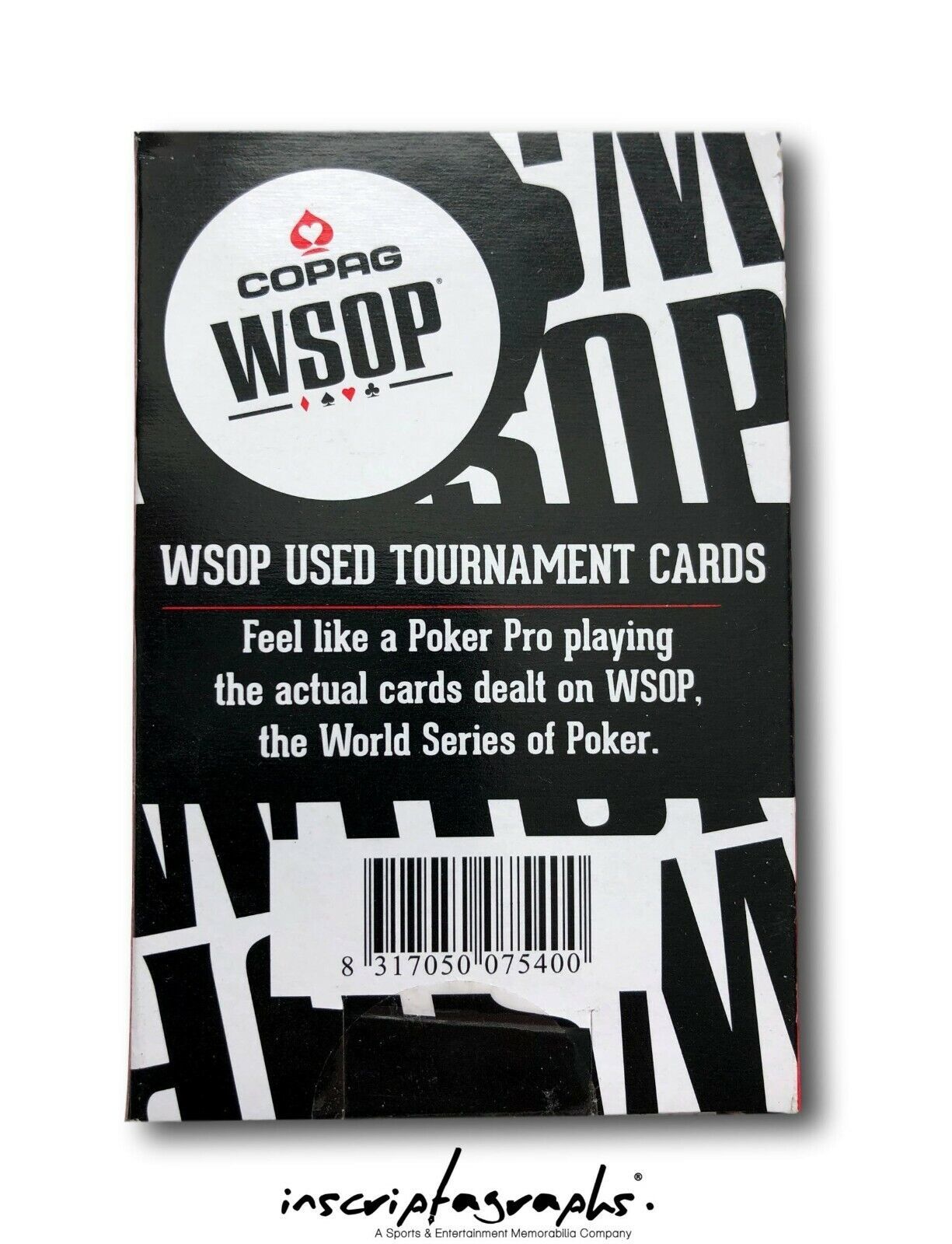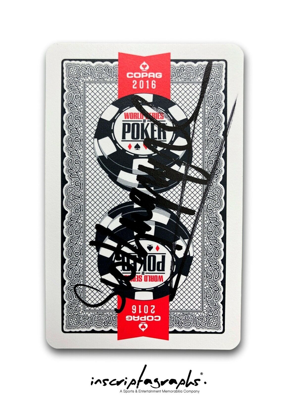Looking for the next big thing to add to your memorabilia collection? Well, this is it! Scotty Nguyen Signed Deck of World Series of Poker Used Playing Cards! This is a very cool item to own from one of the most famous Professional Poker Players of all time and the 1998 World Series of Poker Main Event Winner! You will receive a full deck of 52 black COPAG brand cards (official brand of cards for the WSOP) that were used during the 2016 WSOP. Scotty has signed the outside card that is displayed in the window on the front of the box (exact card signed may vary deck to deck). The back of the box has the authenticity information stating the deck of cards was actually used at the WSOP which comes from the manufacturer of the cards, once again COPAG! Wow!! This is a must-have item for all Scotty Nguyen or Poker fans' man caves, offices, lady lairs and game rooms! Our company has an exclusive memorabilia contract in place with Scotty so our company, Inscriptagraphs memorabilia, is the only place that carries his exclusive line of autographs and poker event used memorabilia!! Shop directly from Scotty Nguyen through our company to guarantee you are receiving the real thing, guaranteed!! This item was signed by Scotty at our private signing with him in Las Vegas on December 7, 2019!! The 1 signed card in each deck comes with a Certificate of Authenticity from our company and guaranteed to be authentic!! Check out the photo of Scotty holding his authentic memorabilia items in the photos of this listing! The Certificate of Authenticity is available on the Inscriptagraphs hologram database website that is indicated on the gold tamper-proof hologram on the item. You will enter the code number on the hologram of the 1 signed playing card into our database (Note: Hologram in the listing is used as a sample COA, your item will have its own unique code #) and up will pop the certificate of authenticity for this item, forever. You can print out that document as proof of the authenticity of this collectible. Inscriptagraphs is proud to only authenticate items that are witnessed autographs amp; in the presence of a company representative. Never will we authenticate 3rd party items based on an "opinion". Never do you have to worry about the authenticity of our collectibles as we pride ourselves in our secure state of the art, industry-leading authentication system. Note: The item listed in this listing is a stock photo and you will receive a comparable item to the one pictured. Autograph location and autograph quality may vary as well as the size of the signature. Only the furthermost card displayed in the window of the front of the deck of the cards is signed.