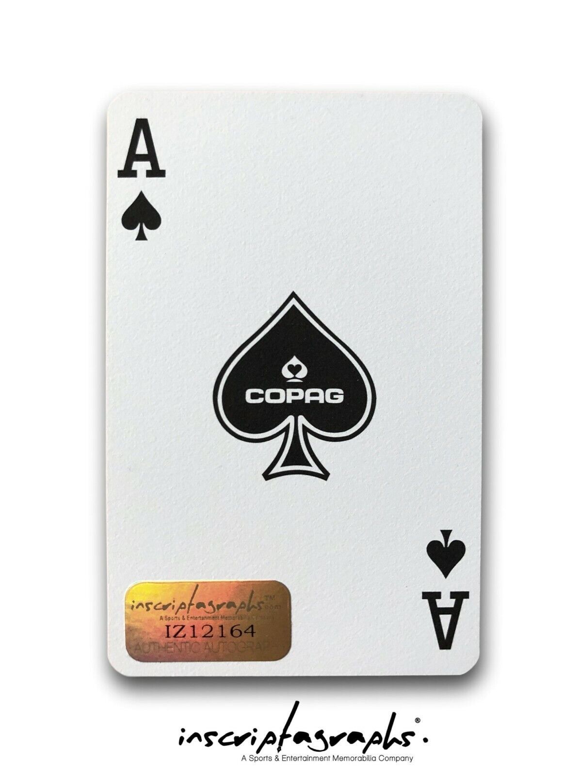The Certificate of Authenticity is available on the Inscriptagraphs hologram database website that is indicated on the gold tamper-proof hologram on the item. You will enter the code number on the hologram of the 1 signed playing card into our database (Note: Hologram in the listing is used as a sample COA, your item will have its own unique code #) and up will pop the certificate of authenticity for this item, forever.