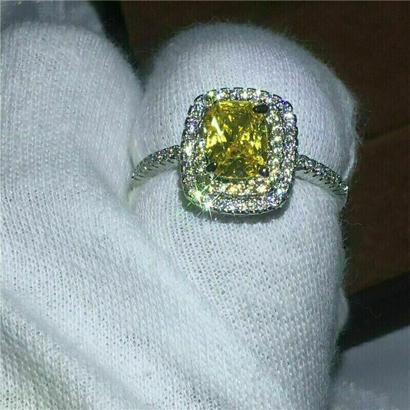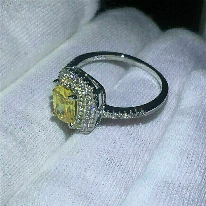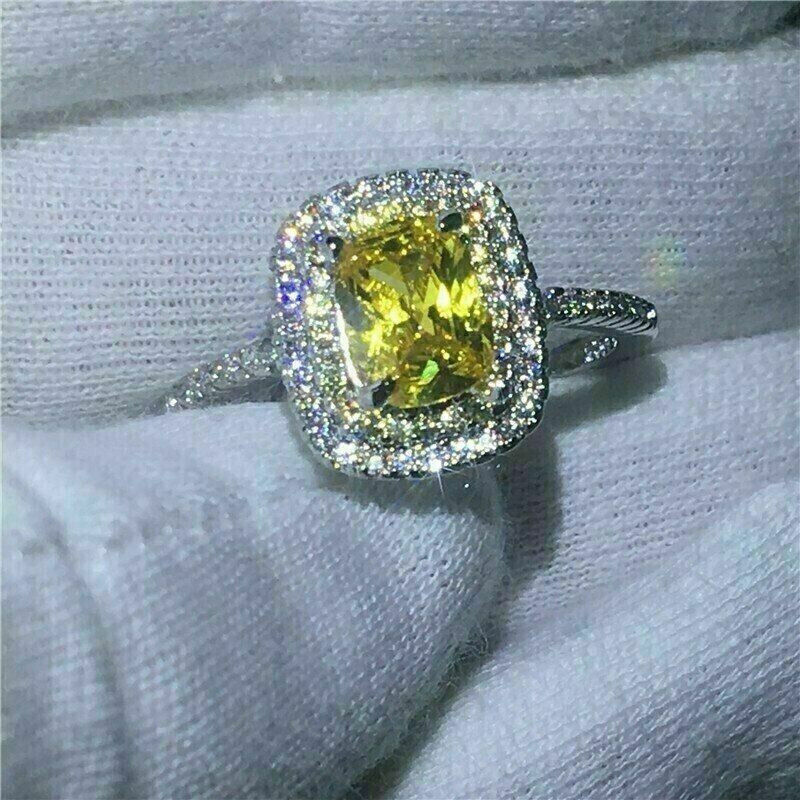 2.20 Ct Cushion Cut CZ Yellow Citrine Halo Engagement Ring 14K White Gold Plated