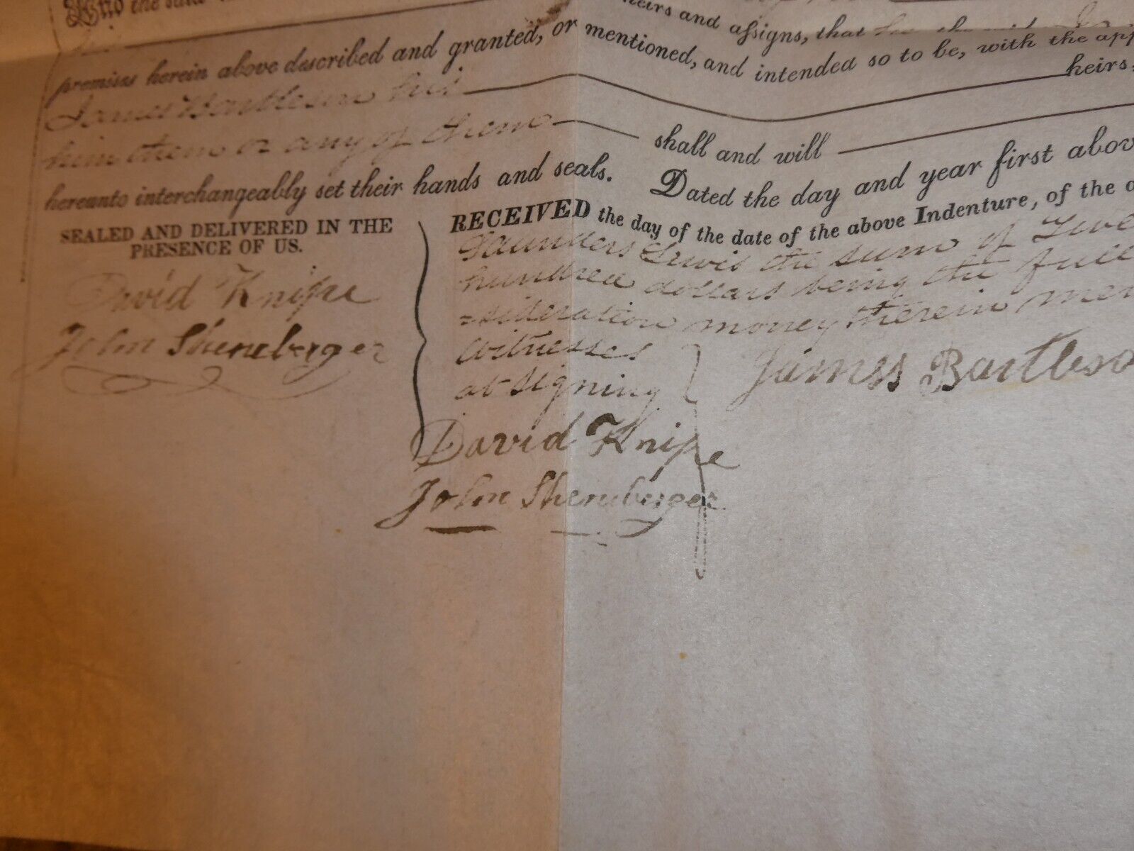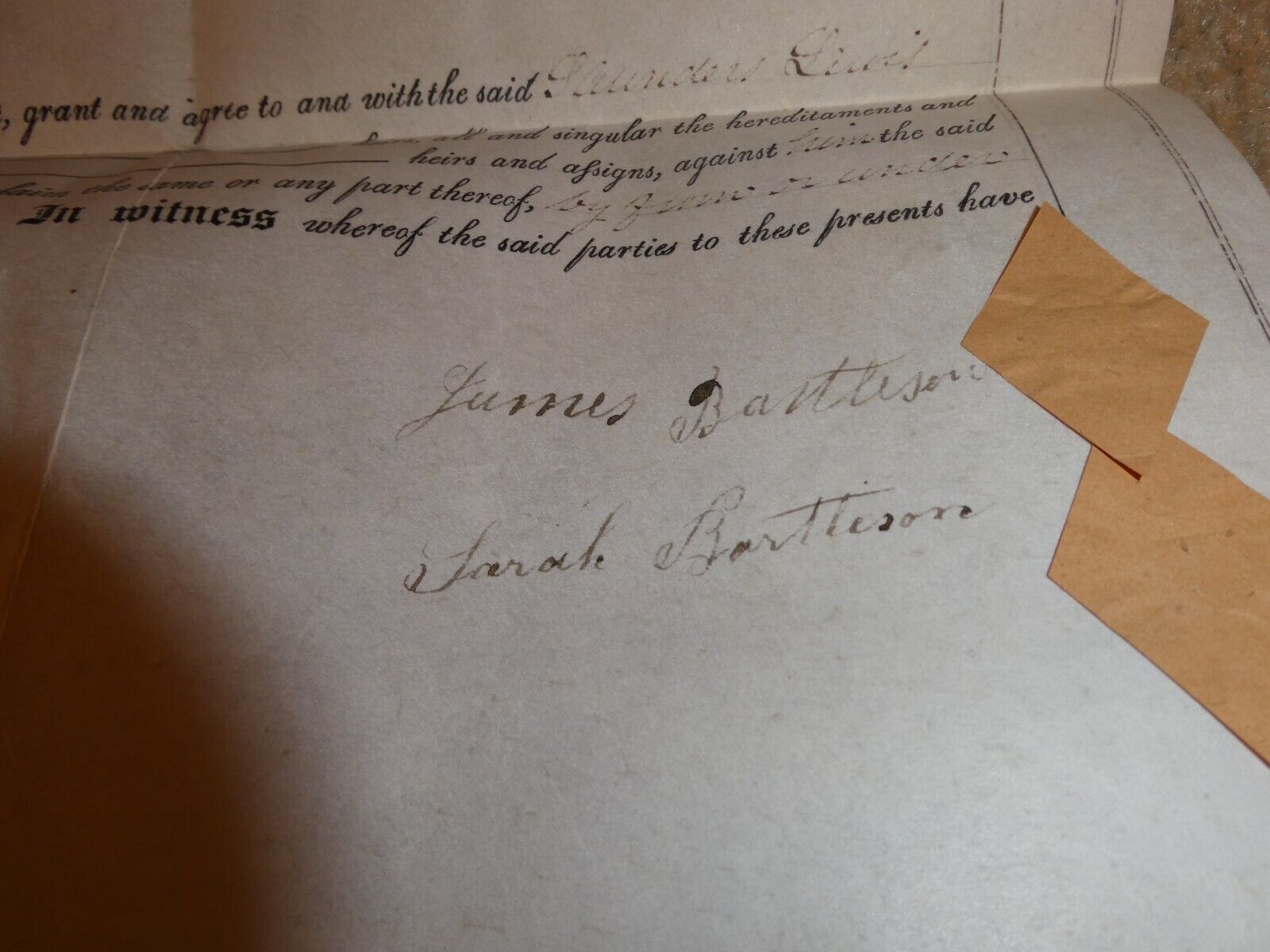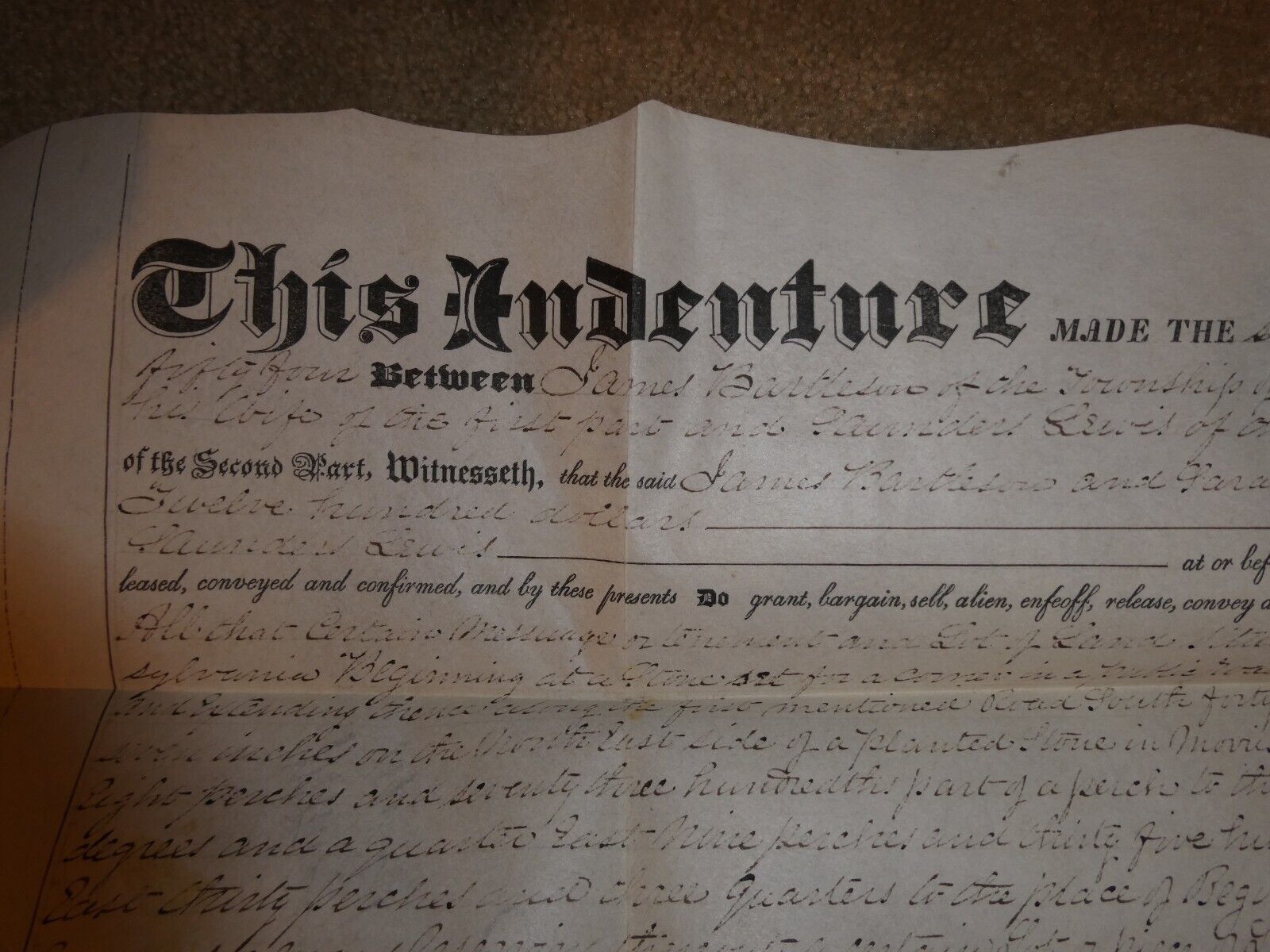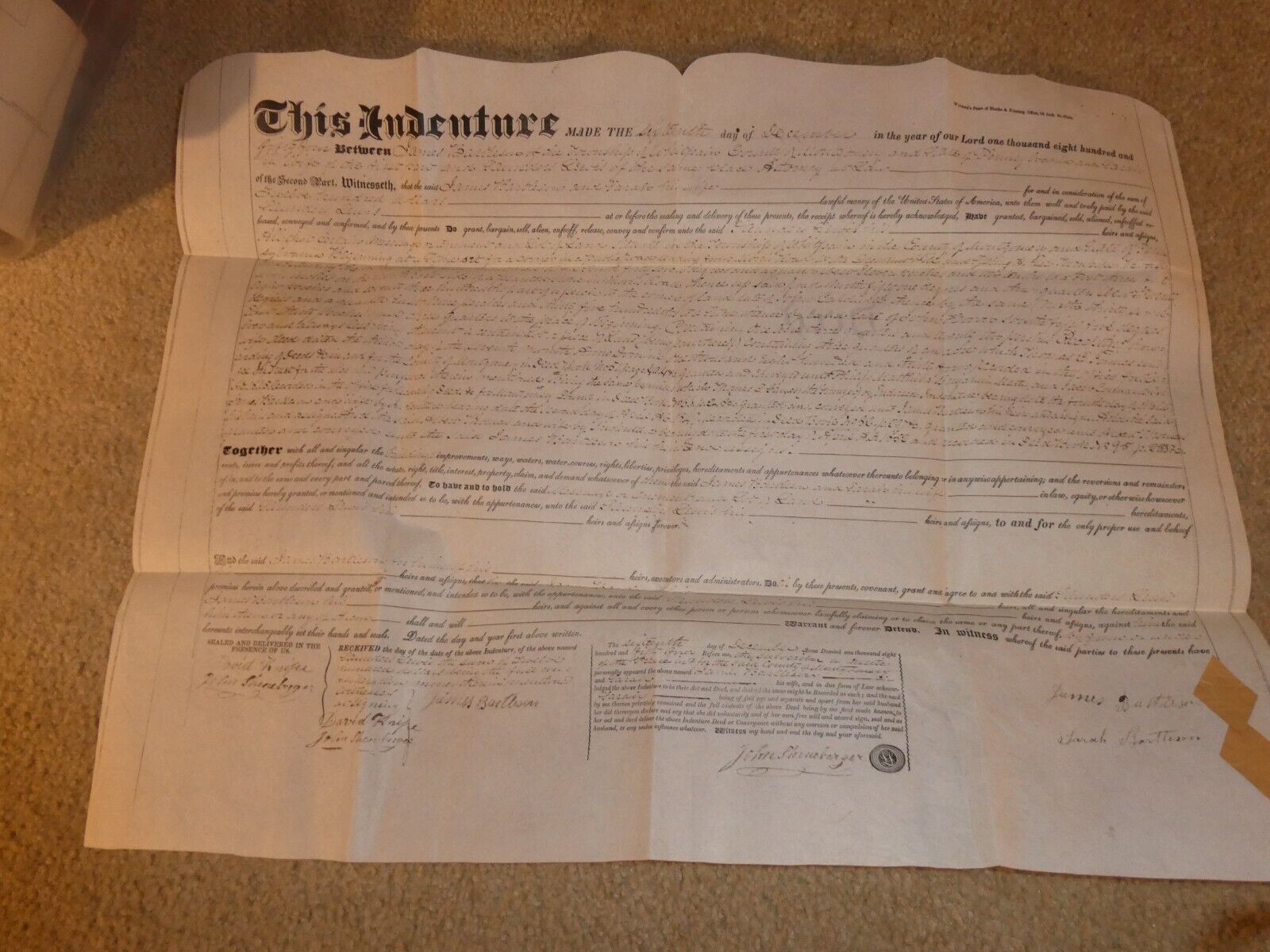 are bidding on a super cool estate sale find, dated December 16 1854. A little hard to read but a few names in here and it's a sale of land in Whitplains Township, Montgomery County, Pennsylvania. Names may be James Bartlison, Sarah Bartlison, David Knife, John Sheneberger. Old seals, About 18 1/2 inches tall, 24 inches wide. Very good shape, folds, light browning, light general wear as shown, neat piece to frame. Zoom in for details.