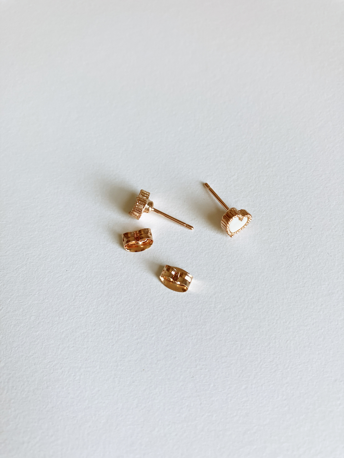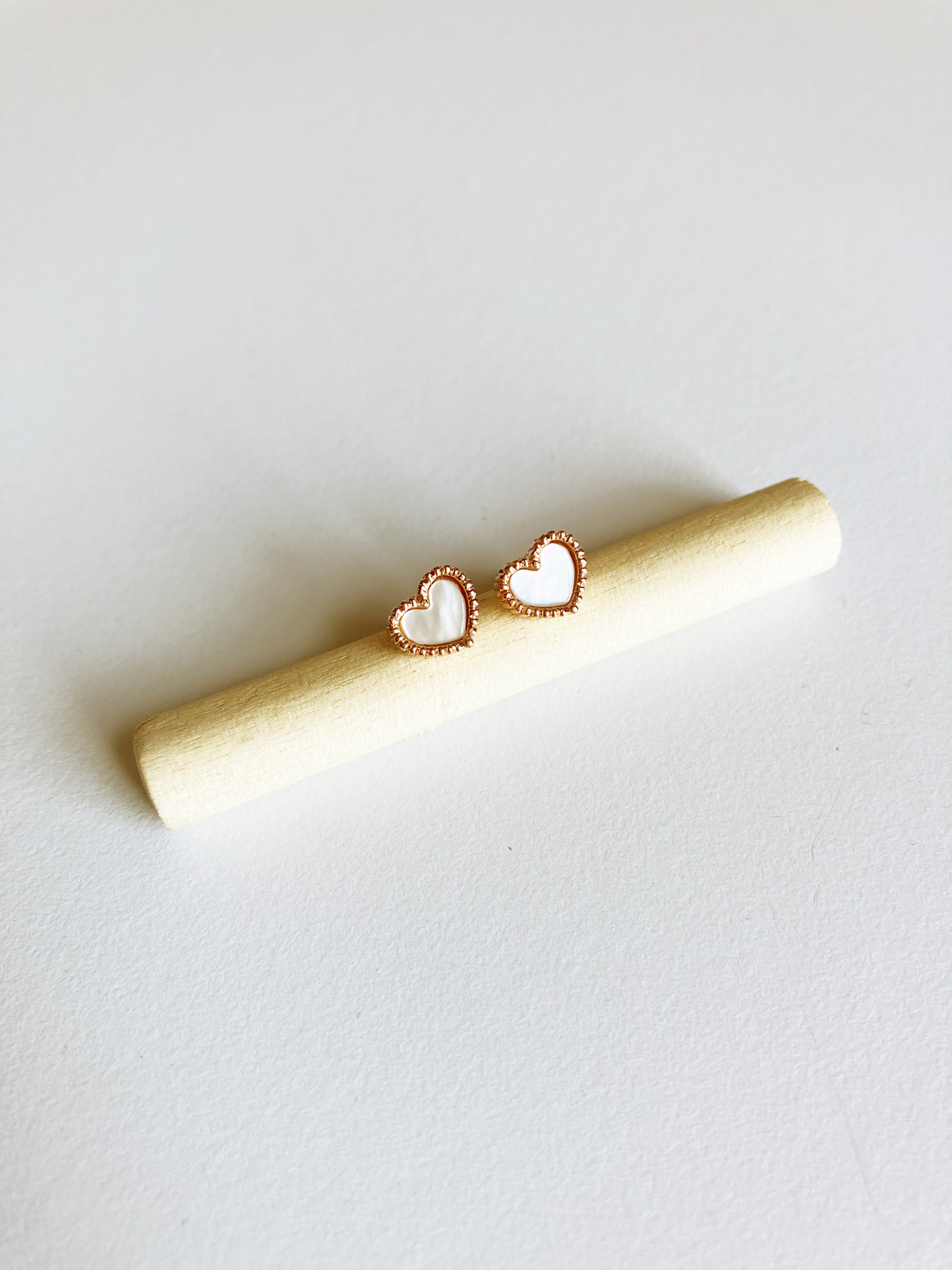 Super-sweet mother of pearl heart motif stud-back earrings with butterfly back in rose gold plated non-tarnishing surgical steel.
