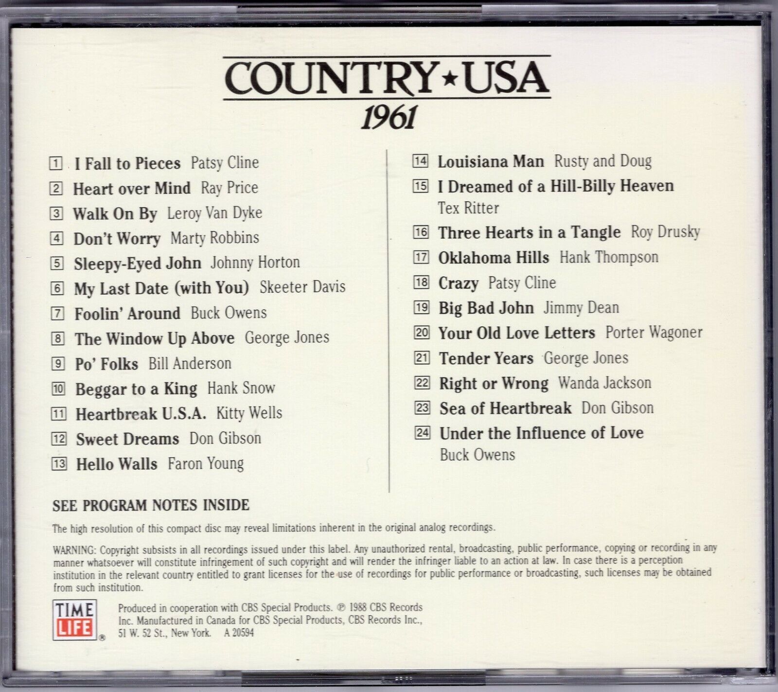You've tapped into a classic! The Time Life Country USA: 1961 CD, part of the legendary Country USA series released in 1988, features 24 original hits that defined country music in that year. Here's the full track list: