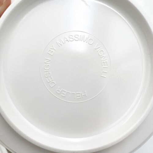 6 Vintage Heller Design by Massimo Vignelli Salad Snack Cereal Bowl white. 3 different logo designs on bottom. One white bowl color is slightly discolored from the rest. 2 bowls show chips on the bottom. Minor light wear and scratches on bowls.