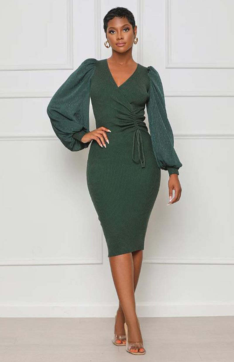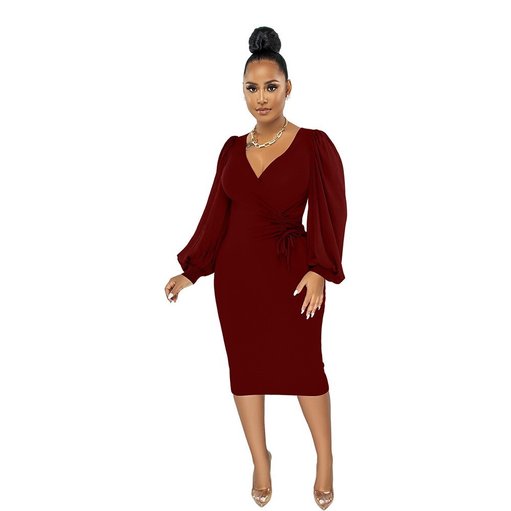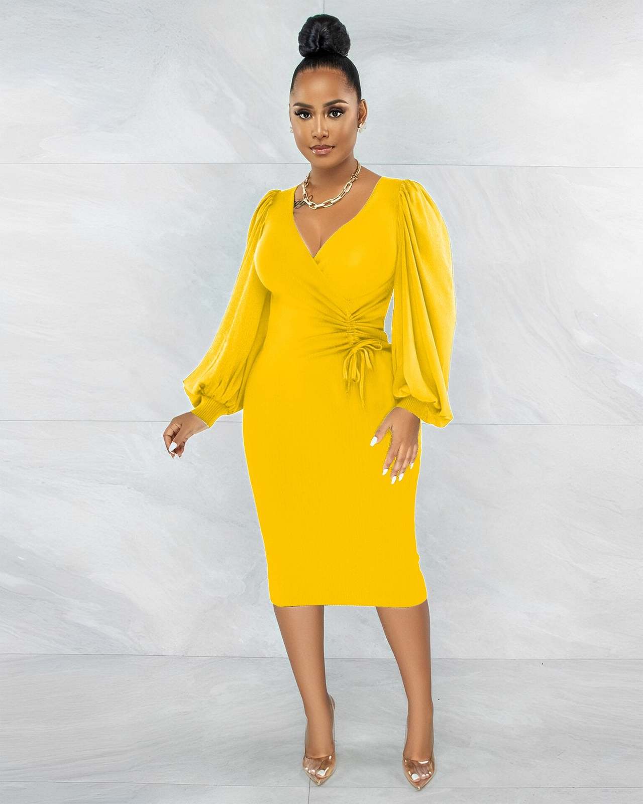 Autumn Winter V Neck Lantern Sleeve Drawstring Dress