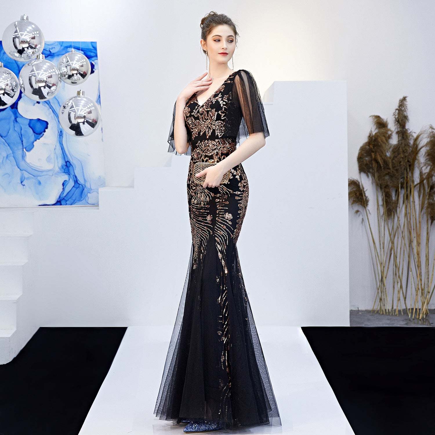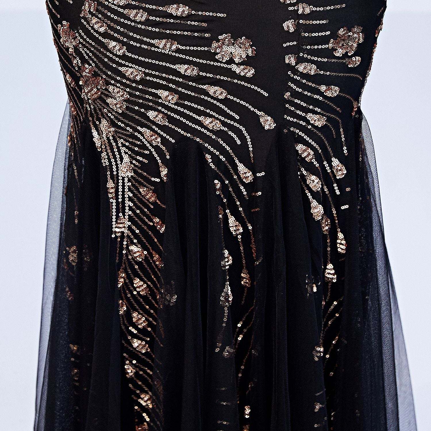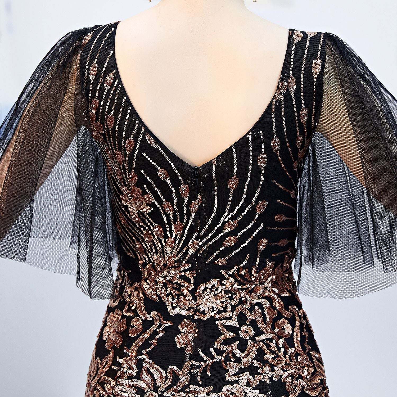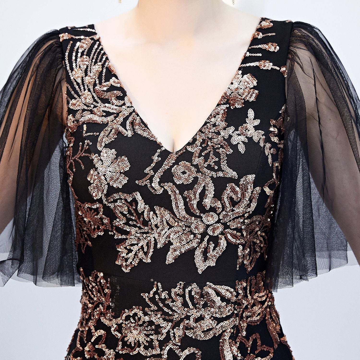Luxury Black Mesh & Gold Floral Sequined V Neck Mermaid Dress