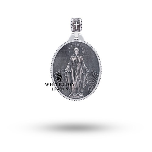The featured Italian-made pendant is cast in .925 sterling silver and showcases a flat brush-finished oval charm intricately detailed with the image of the Holy Virgin Mary. The oval charm is then finished with a sturdy bail that can accommodate most chain sizes.