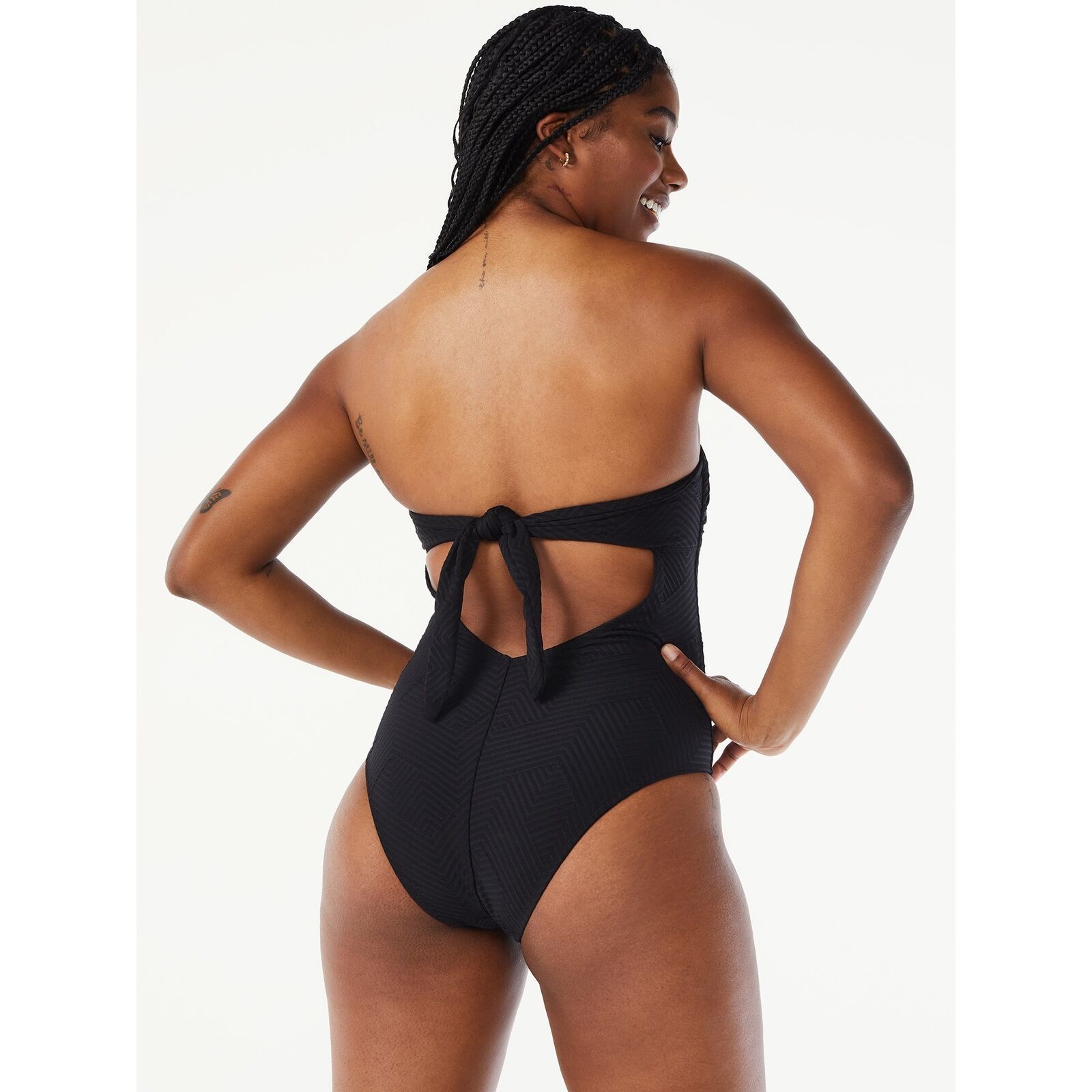 Do you bandeau? A strapless design in a modern texture adds newness to your swimsuit collection. Love Sports One-Piece Swimsuit hugs your curves, creating a flattering hourglass silhouette and deep V in back is accented with an adjustable tie for a little extra special attention. Style tip: add the neck strap if you feel like taking a dip or go without for maximum impact.