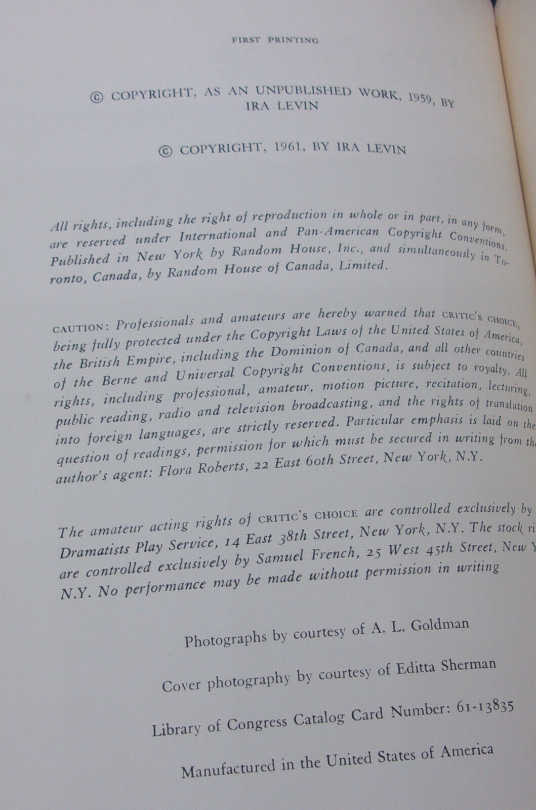 Ira Levin CRITIC'S CHOICE First edition 1961 A Random House Play A NICE COPY DJ