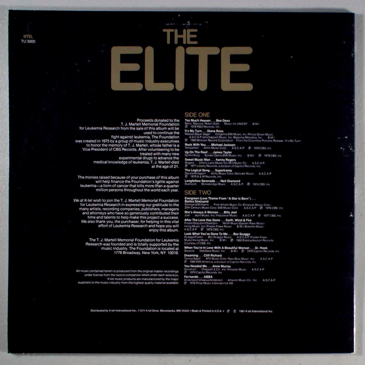 The Elite is a K-Tel collection featuring hit songs across many genres. R B is represented by the likes of Diana Ross and Michael Jackson; DIsco makes an appearance with hits from the Bees Gees and Abba; Country is brought by Kenny Rogers and Anne Murray; and Pop/ROck favorites from Barbra Streisand, Supertramp, Billy Joel, and Dr. Hook.