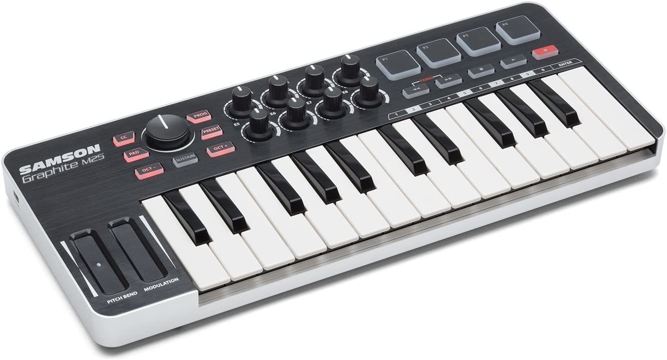 Samson's Graphite M25 USB MIDI Controller gives you all the music production control you need for home studio and mobile applications. Packed into an ultra-portable design, the Graphite M25 features a 25-key velocity-sensitive mini keyboard, trigger pads with aftertouch, a full-featured control surface and additional programmable functions for advanced playability and customization. And with iPad/USB bus power and plug-and-play operation, the Graphite M25 makes it easy to express your most dynamic musical ideas, no matter where creativity strikes.