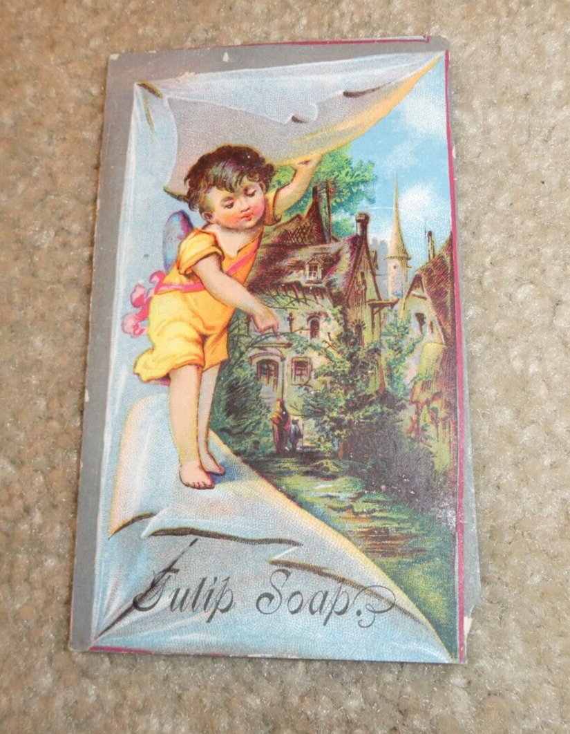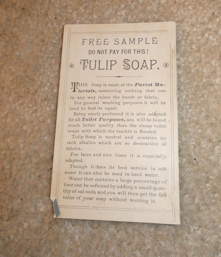 You are bidding on a super cool 1870s to 1880s era, double sided advertising trade card, an original Victorian trade card for Tullip Soap as shown in the pictures. Oddball item. About 4 3/4 inches tall, 3 inches wide. Good shape, light surface wear, chipped off lower corner, some edge nicks and chips, light staining on back from being in a scrapbook, a neat piece to frame. Zoom in for details.