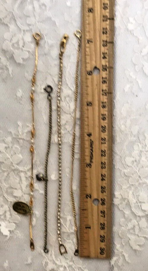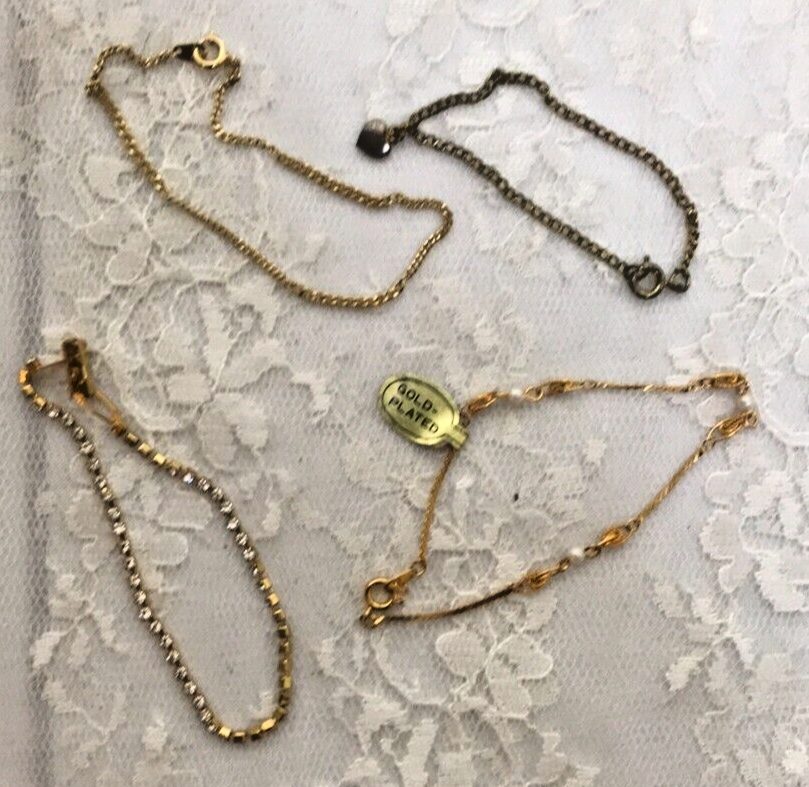 Set of 4 chain bracelets 5.5-7? - One Gold Plated. These 4 small bracelets came from several jewelry lots. One is a rhinestone chain, one is gold plated. And the other two are of unknown origin. The tiny one is tarnished, otherwise they are in Excellent Used Condition - See Photos for further description.
