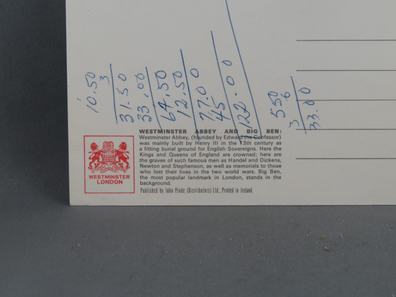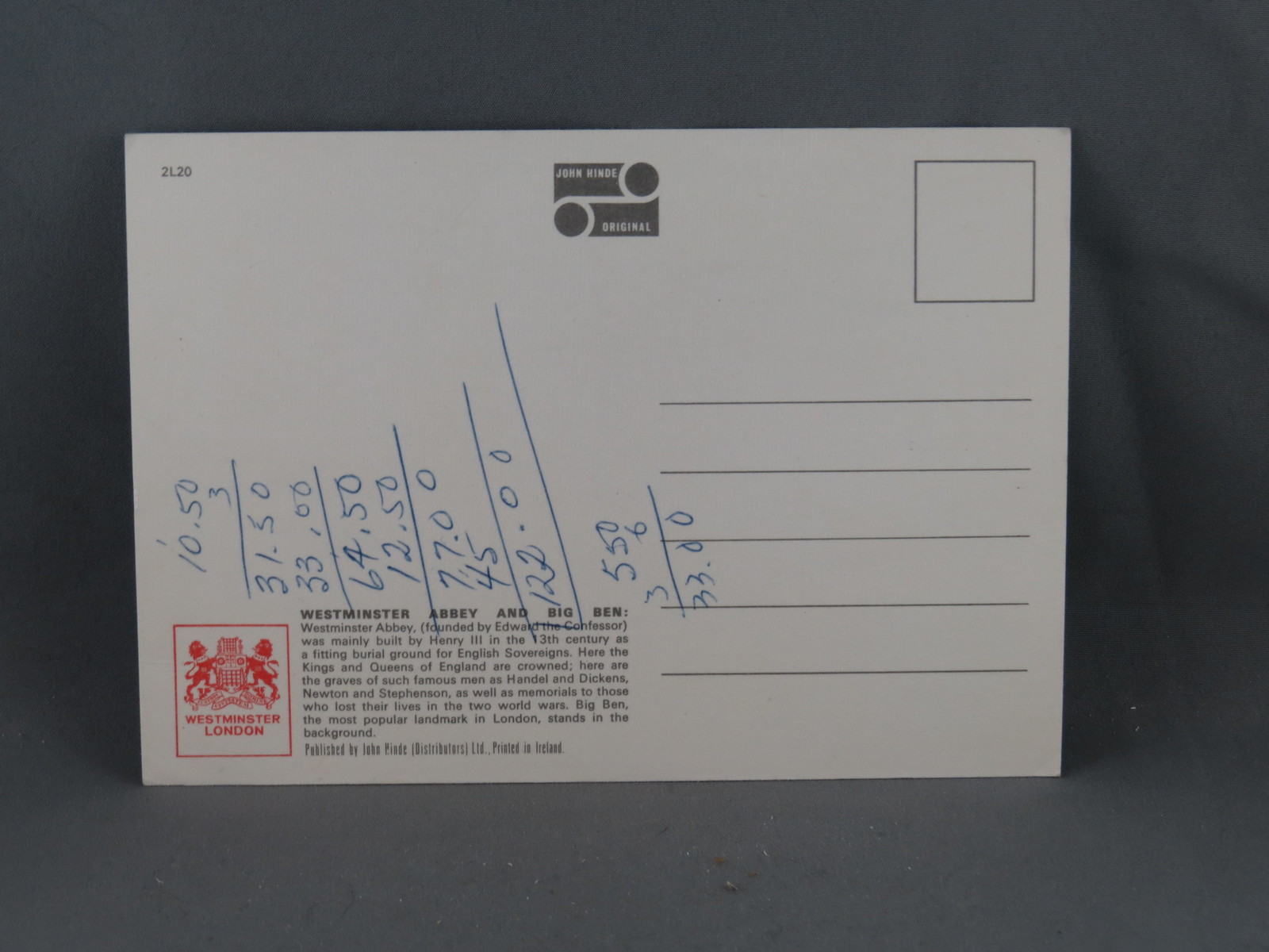 Up for sale is a vintage postcard. It features an image of Westminster Abbey and the Big Ben Clock Tower located in London England. What a great addition to any collection. Please note the pen writing of math on the postcard.