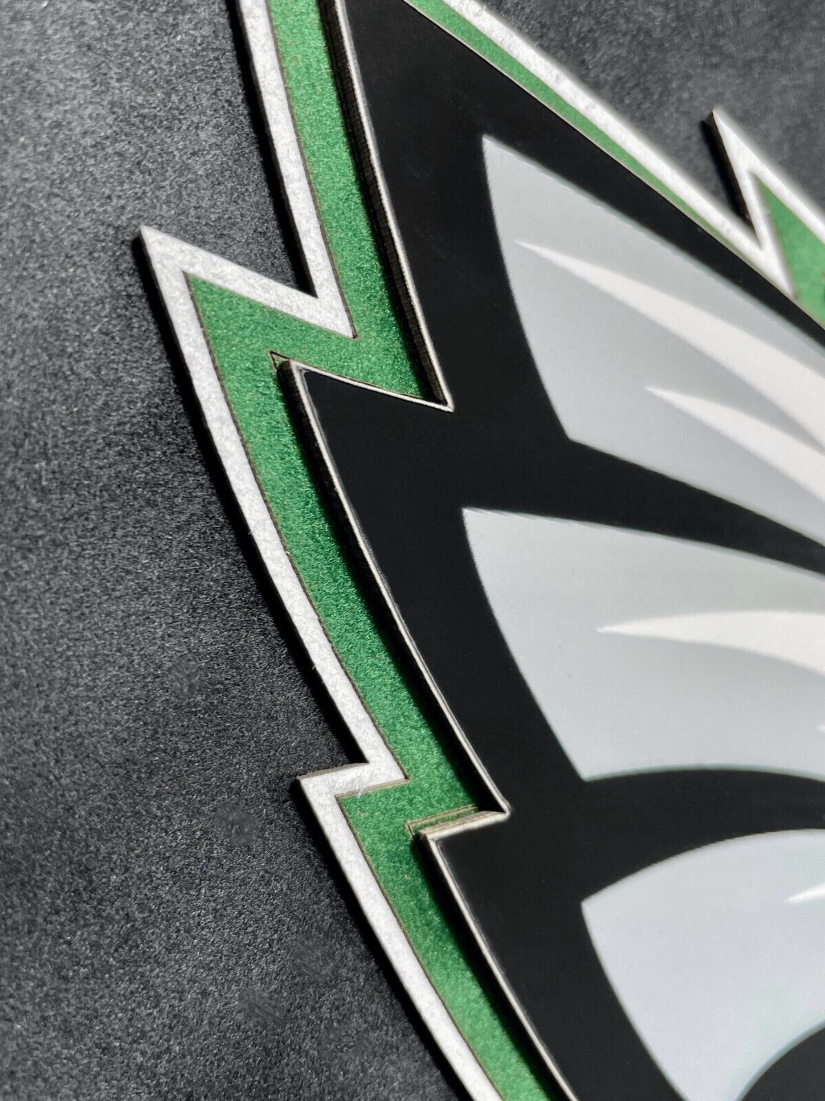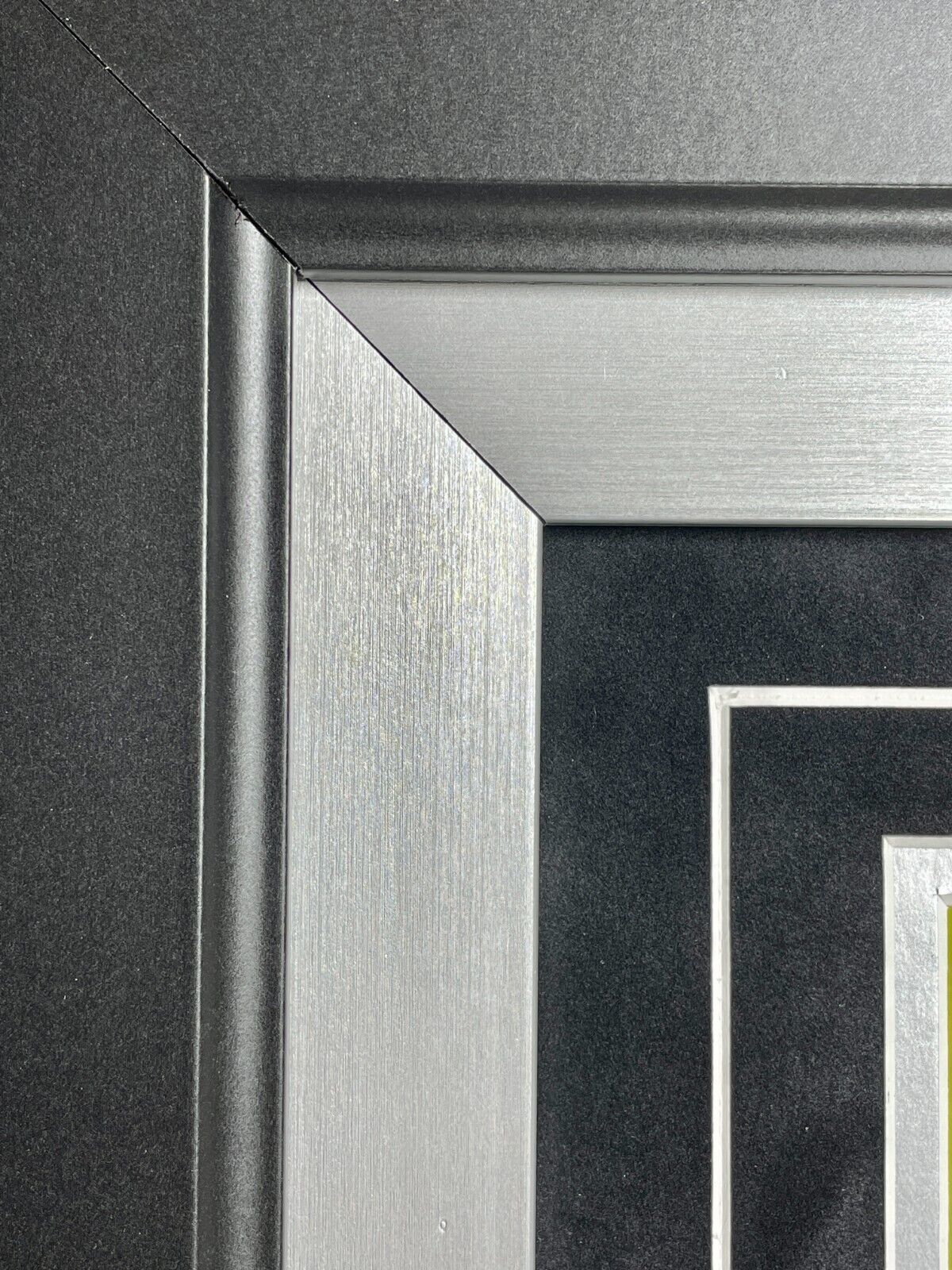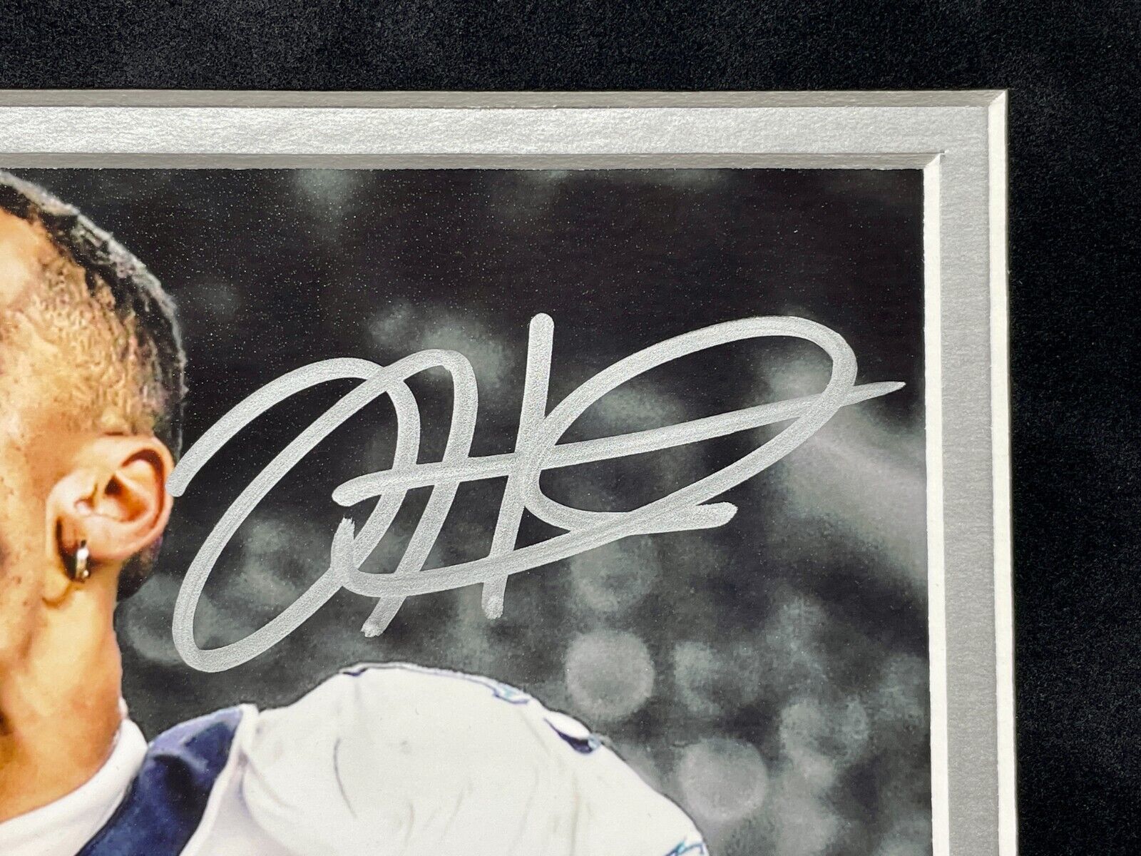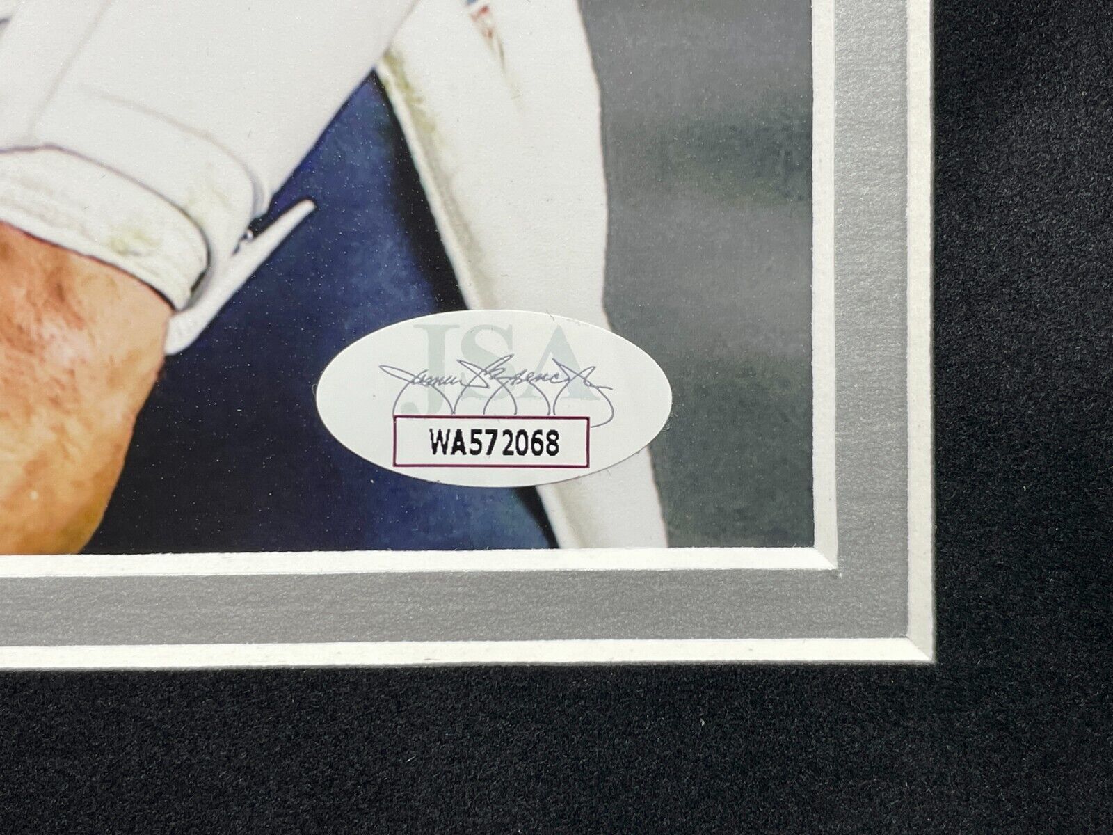 If you are looking for a high-end signed piece to display on your wall, then look no further. This piece comes professionally museum quality custom framed with double matting with a black suede top mat, a laser cut suede team logo, 4" x 6" photos and a metal nameplate! In addition, the piece measures approximately 27" x 25" x 1" in size in a double black with silver frame and a plexiglass display. As soon as you open the box on your doorstep, your piece is ready to hang on the wall. The custom frame workmanship on this piece is second to none in the industry, and this type of quality is very difficult to find.