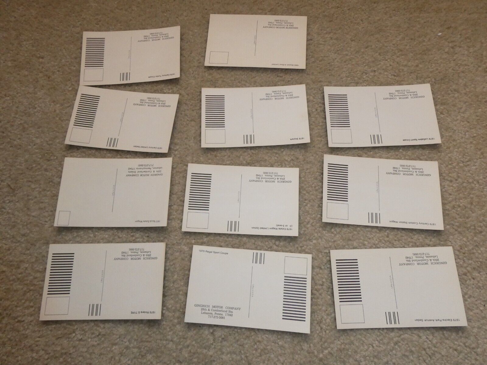 are bidding on a nice, lot of 11 vintage 1977 to 1980 dated, mostly Buick car advertising postcards with the Gingrich Motor Company dealer stamp on back. Neat old lot of postcards, unused. Unused old stock, would look good framed. Zoom in for details.