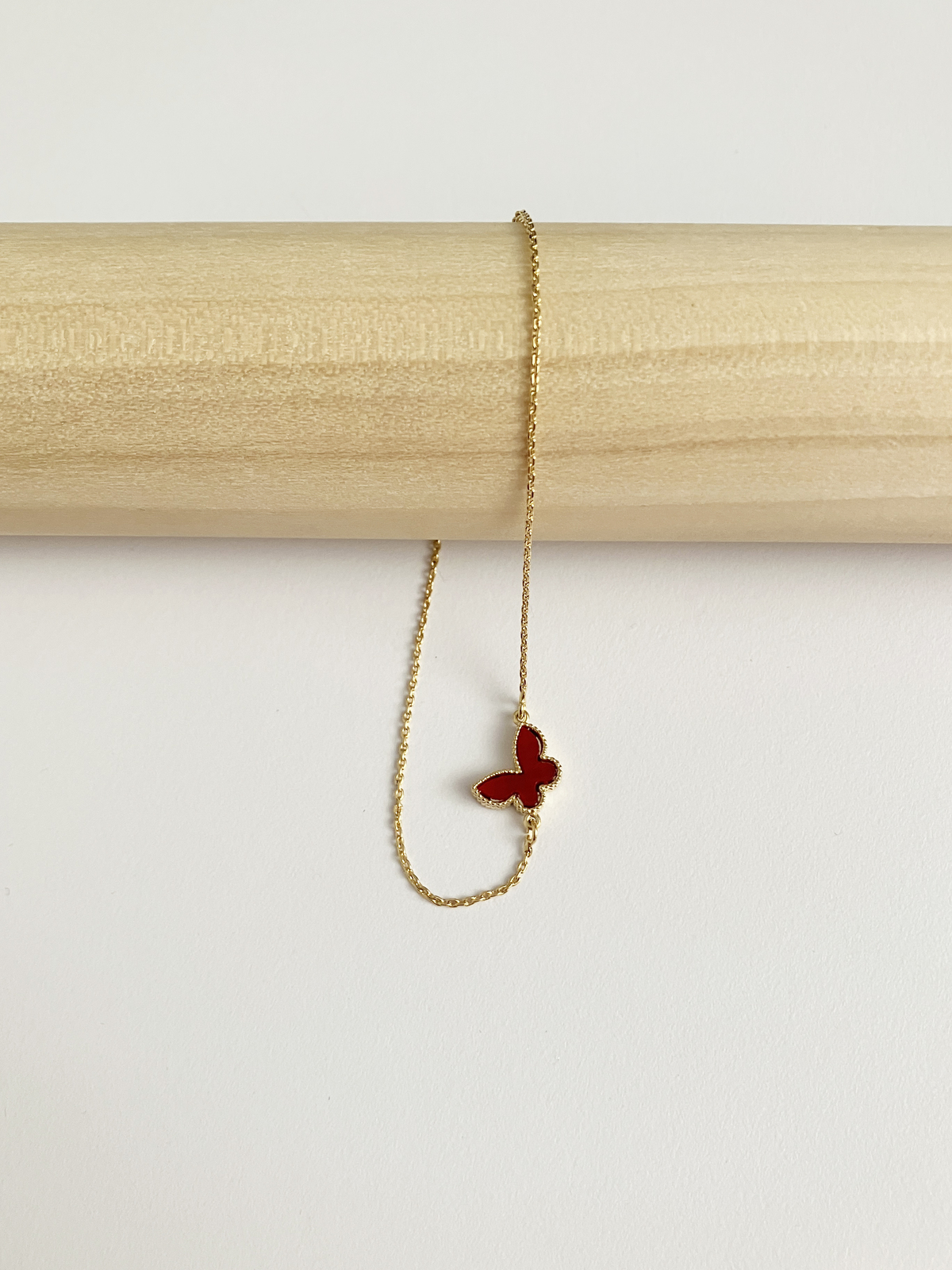 Adjustable 7.5" carnelian butterfly motif bracelet in gold plated non-tarnishing surgical steel with lobster clasp. The perfect perennial accessory.