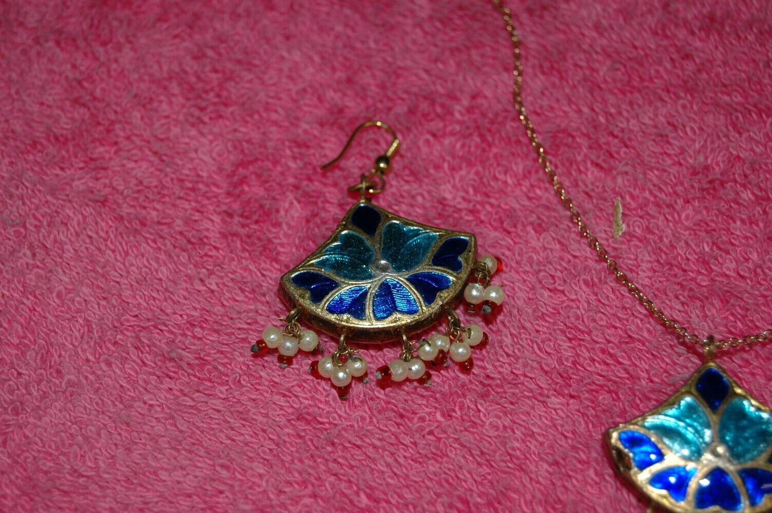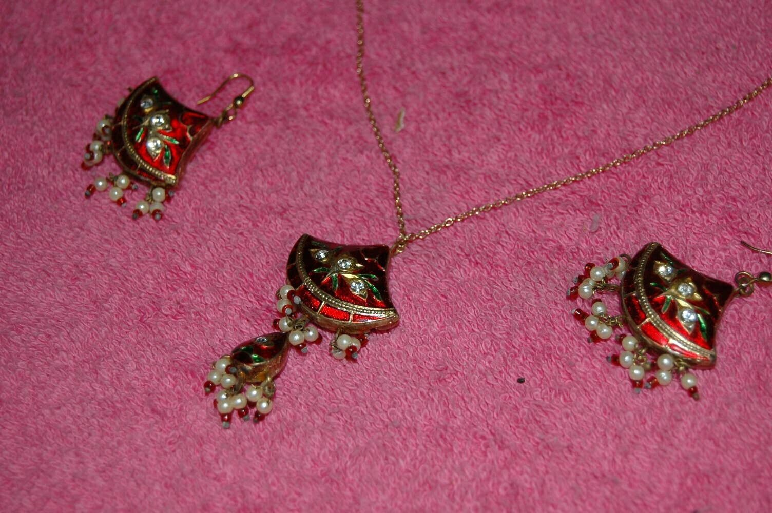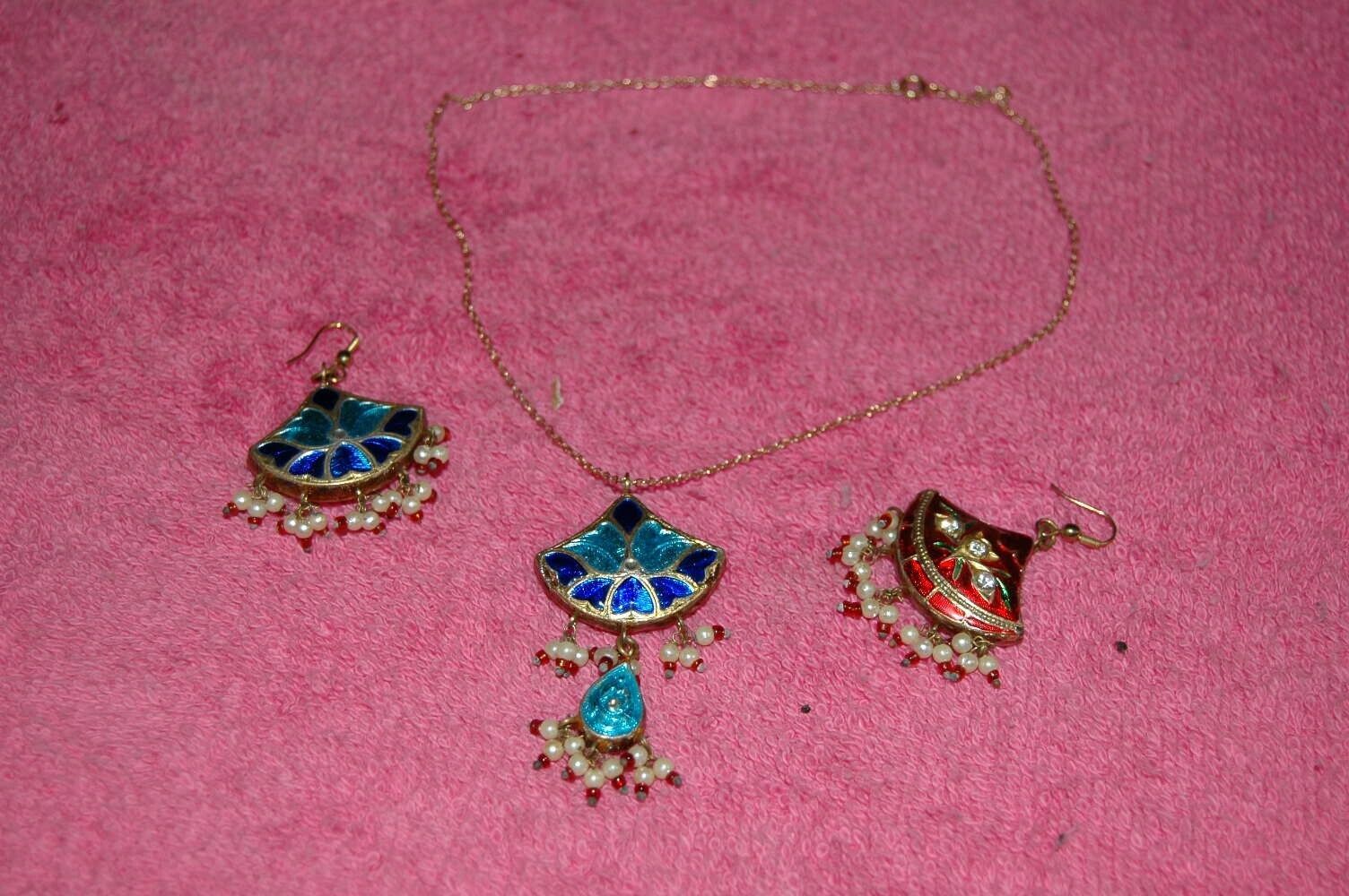 Here is a neat vintage necklace and earring set. This was picked from an estate and we know nothing about it. Has a Cloisonne look but may be handpainted other material. . Jeweled pendant and earrings. Necklace is 15.5 inches long from end to end. Earrings are 2 inches long. Age and maker are unknown. Red on one side..Blue on the other. Make a great gift or addition to any jewelry collection.