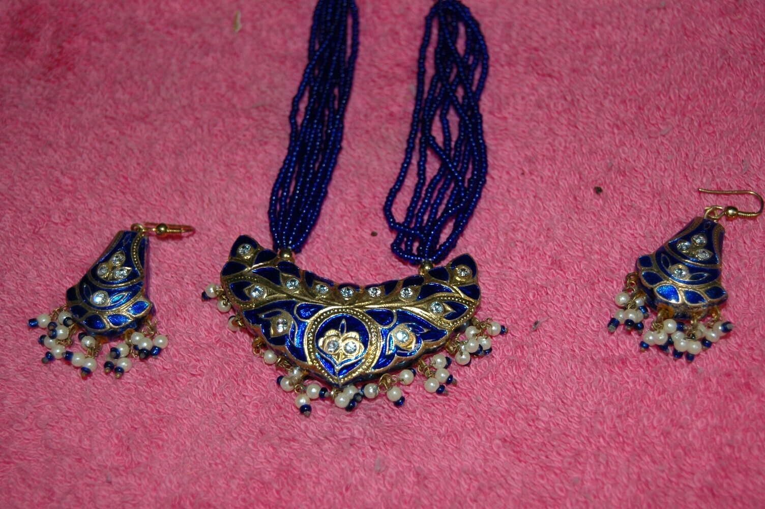 Here is a neat vintage necklace and earring set. This was picked from an estate and we know nothing about it. Feels and looks to be Cloisonee. Jeweled pendant and earrings. Necklace is 15 inches long from end to end. Earrings are 2 inches long. Age and maker are unknown. Make a great gift or addition to any jewelry collection.