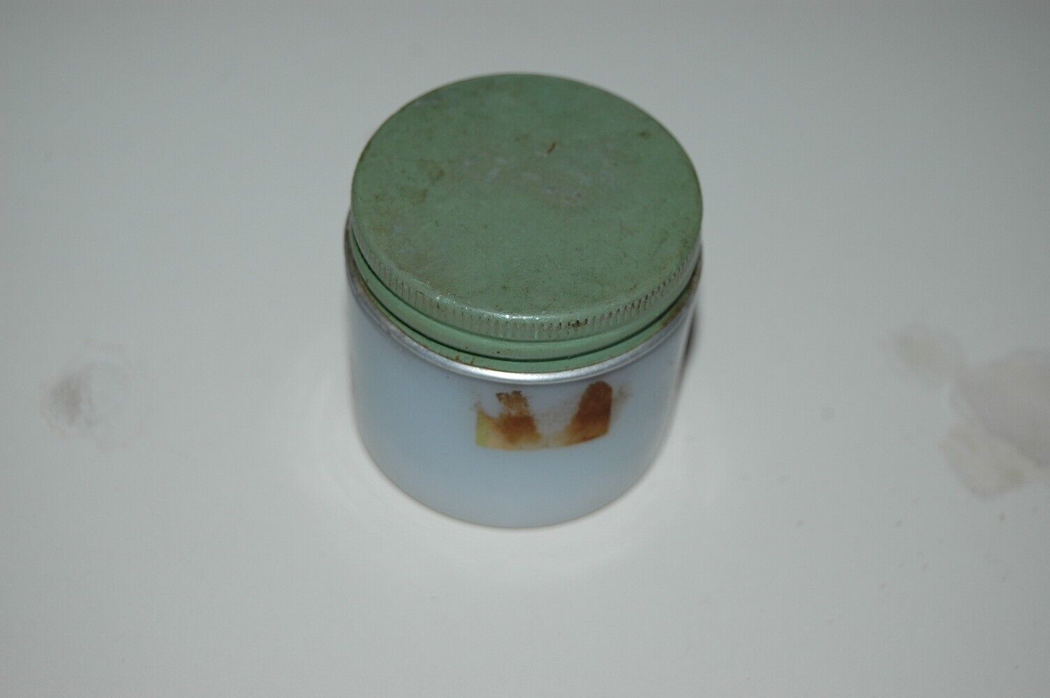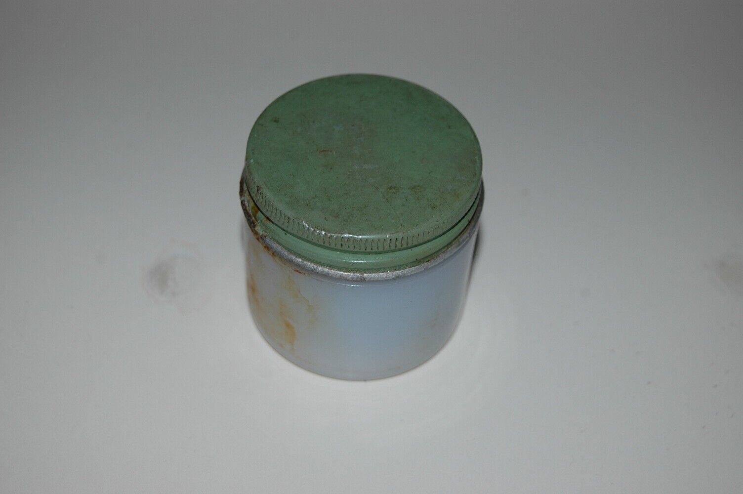 Vintage jar. Missing the label. Age is unknown. Milk glass with a metal lid.