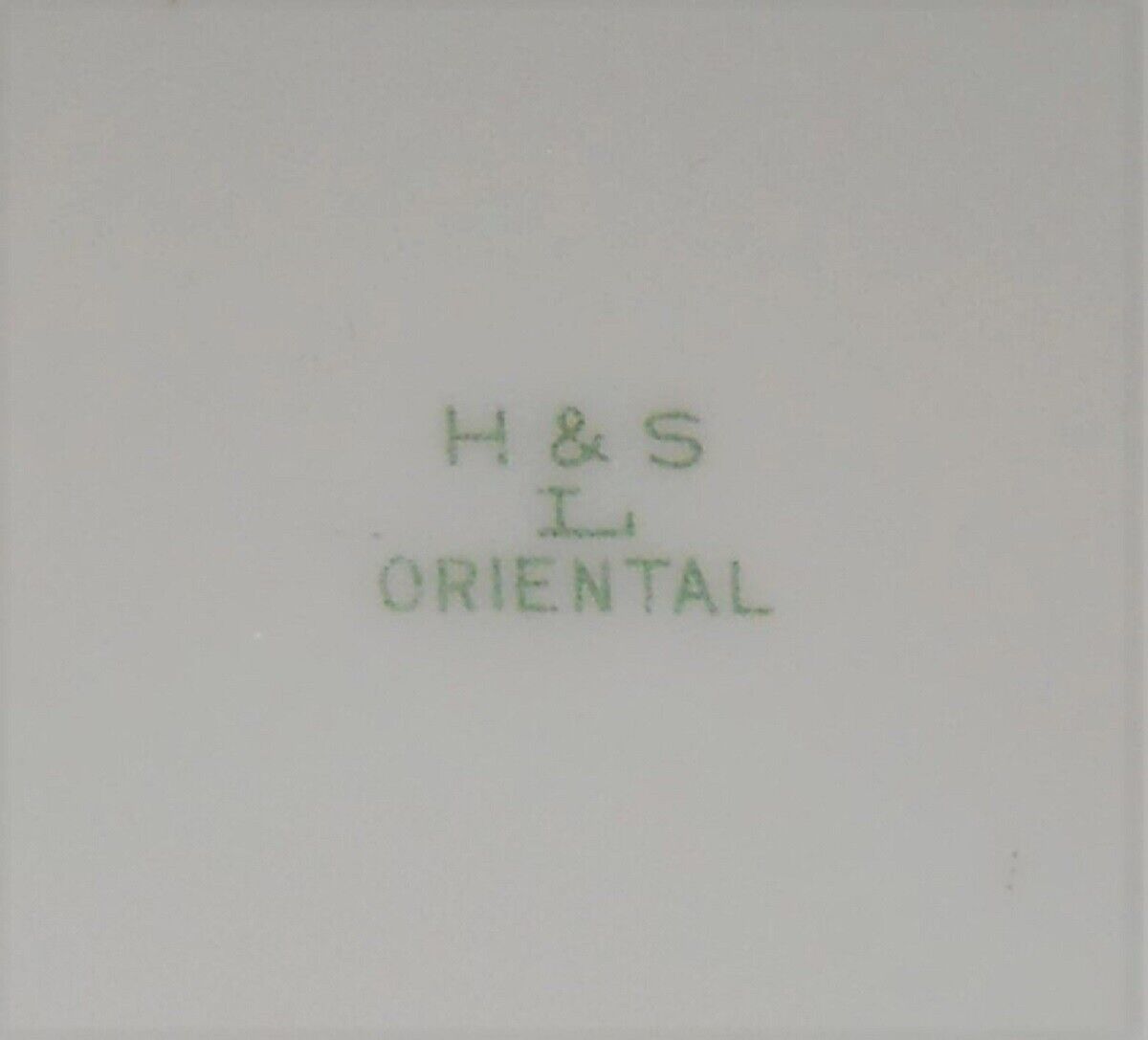 This is an 8 1/2" Porcelain Flow Blue Plate with an encrusted gold design on the surface that is marked as shown in photos above H S L ORIENTAL. I do not know the age but I know it is vintage and possibly antique (100+ years). It came from an estate Flow Blue Collection. It is a beautiful plate and in good pre-owned condition with no chips or cracks and the gold is vibrant in color.
