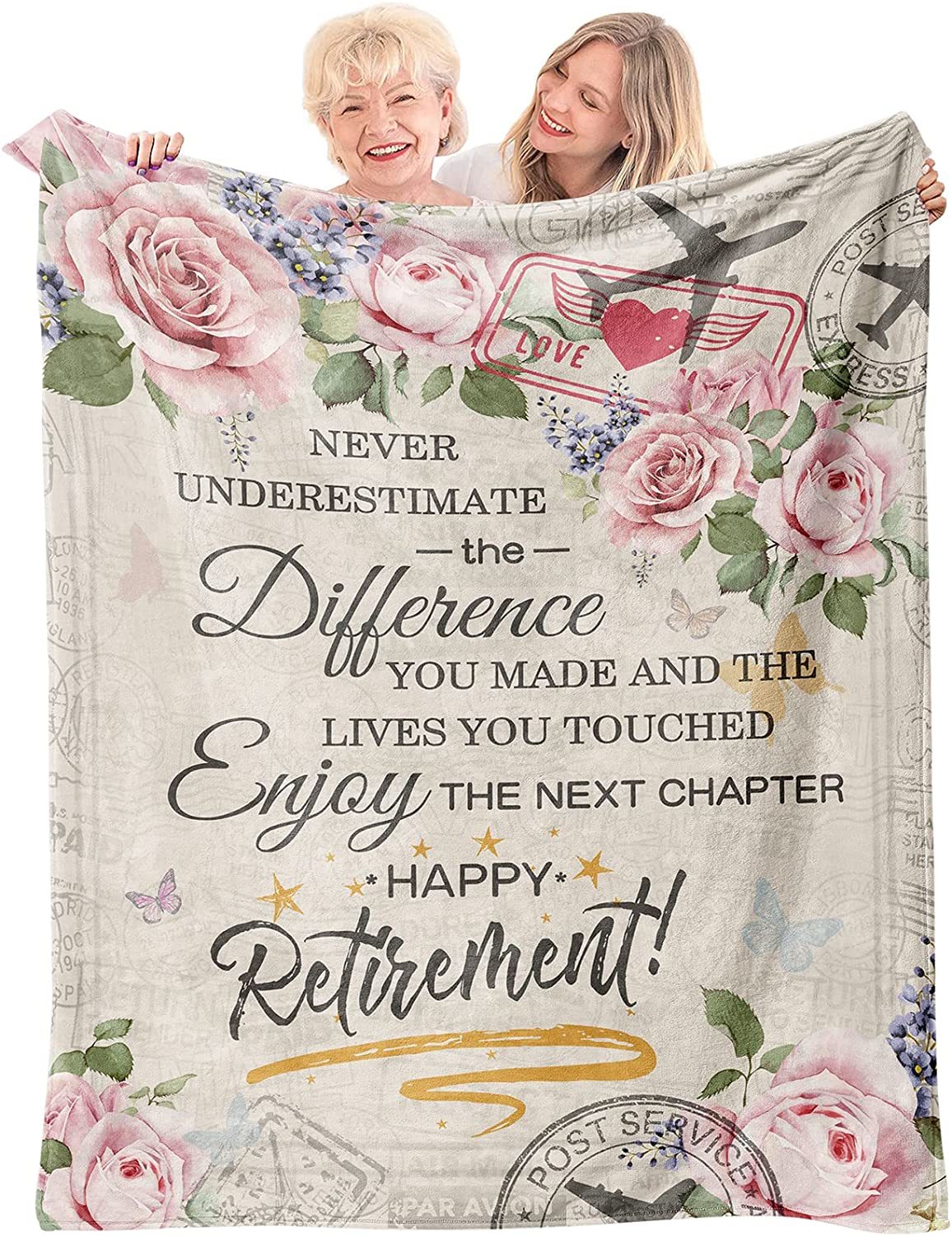 ? ?Meaningful Retirement Gifts?Beautiful and cozy warm with a heartwarming message. It's an ideal happy retirement gifts choice to be sent to newly or soon-to-be retired women at retirement party, retirement gathering, retirement luncheon or as a leaving gift, going away gift, farewell gift, goodbye gift, great party souvenir, Thanksgiving Day gifts, Christmas gifts ? ?Durable Material? Our plush throws blankets, made by Anti-pilling flannel to feel like a warm hug, touch so softly and comfortably, and are suitable for all seasons. It measuring 60x50 inches(152*127cm). Our throw blanket is a gift you?ll be proud to give and one she?ll cherish forever ? ?Best Retirement Gifts Ever?Perfect present suitable for mom, grandma, sister, wife, daughter, friend, colleague, boss lady, neighbor, teachers, nurses, doctors, police, social worker who are the retired. A gift to retired people way for the giver to express love, make her feel warm and loving ? ?Many Functions? Perfect throw blankets can be used as a lap blanket, summer air-conditioning blanket, nap blanket, travel blanket, couch throw, picnics in the park, outdoor events, or posing as a stylish bed cover. Get coziness with this soft and fuzzy blanket, perfect for snuggling up on the sofa, bed, chilled movie theater, park, or any occasion, and it is not only functional but also a decorative item as a part of a bedding set on a bed ? ?Easy Care? Gently wash with cold water, then air or tumble dry on low heat. Just remember.do not bleach, iron, or dry clean. Since the product is shrink-wrapped, there might be a little wrinkles, which will disappear after washing.